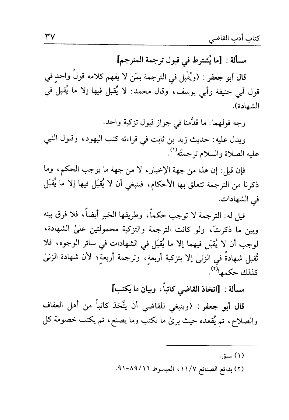 قال أبو جعفر: (ويقبل في الترجمة بمن لا يفهم كلامه قول واحد في قول أبي حنيفة وأبي يوسف، وقال محمد: لا يقبل فيها إلا ما يقبل في الشهادة).
