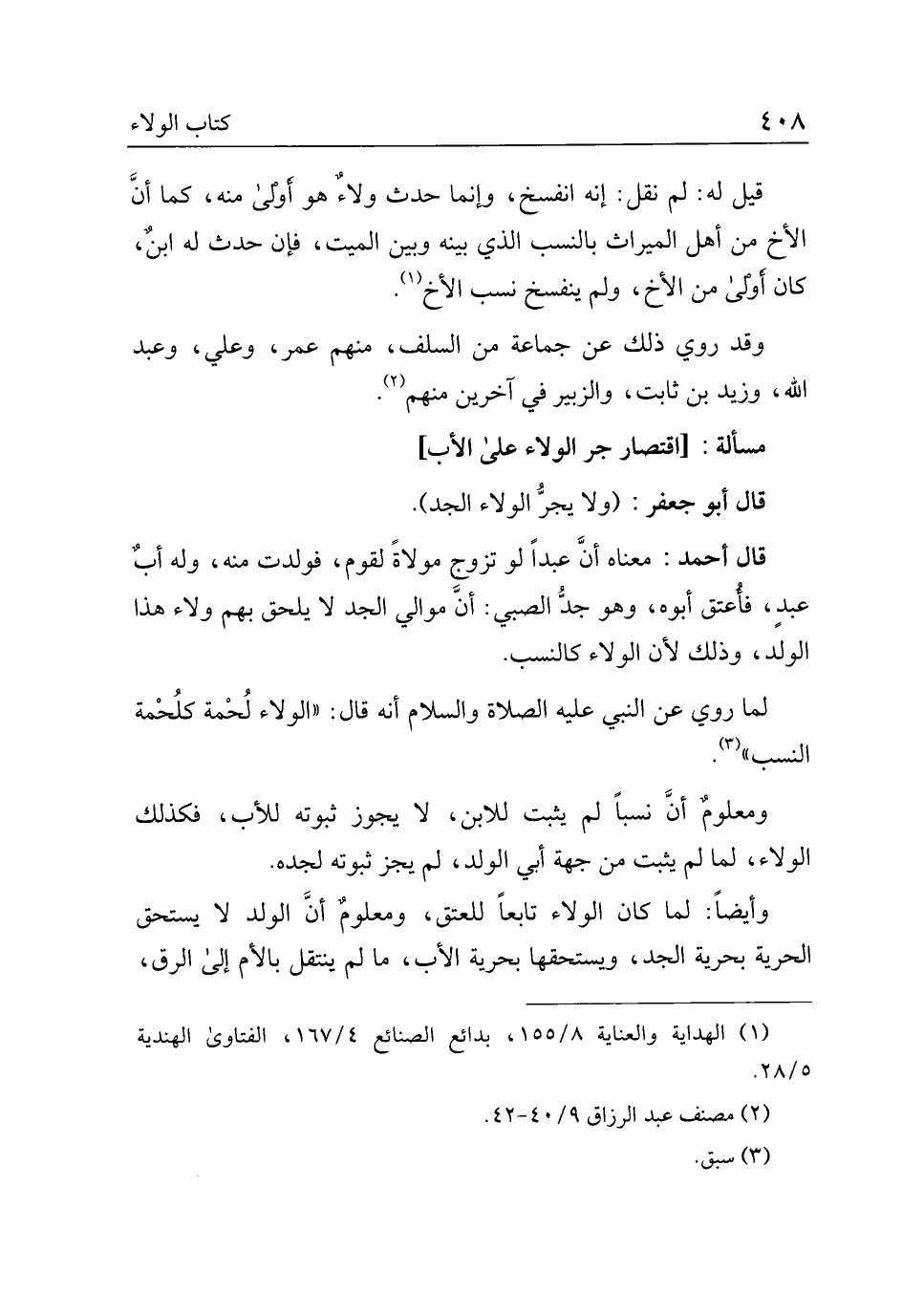 وأيضا: لما كان الولاء تابعا للعتق، ومعلوم أن الولاء لا يستحق الحرية بحرية الجد، ويستحقها بحرية الأب، ما لم ينتقل بالأم إلى الرق،