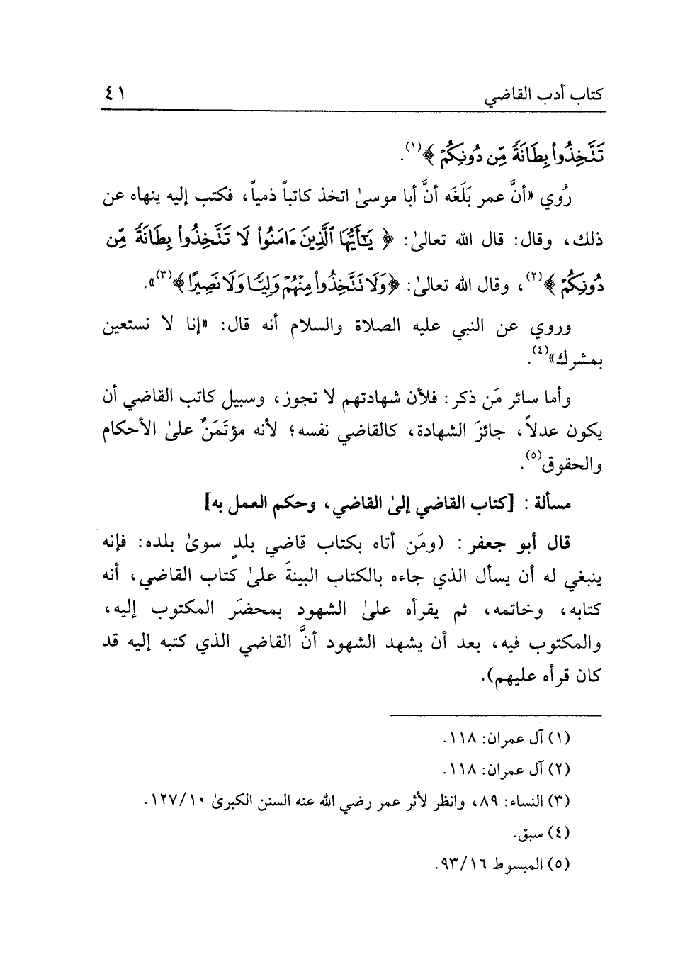 روي "أن عمر بلغه أن أبا موسى اتخذ كاتبًا ذميًا، فكتب إليه ينهه عن ذلك، وقال: قال الله تعالى: {يأيها الذين ءامنوا لا تتخذوا بطانة من دونكم}، وقال الله تعالى: {ولا تتخذوا منهم وليًا ولا نصيرًا} ".