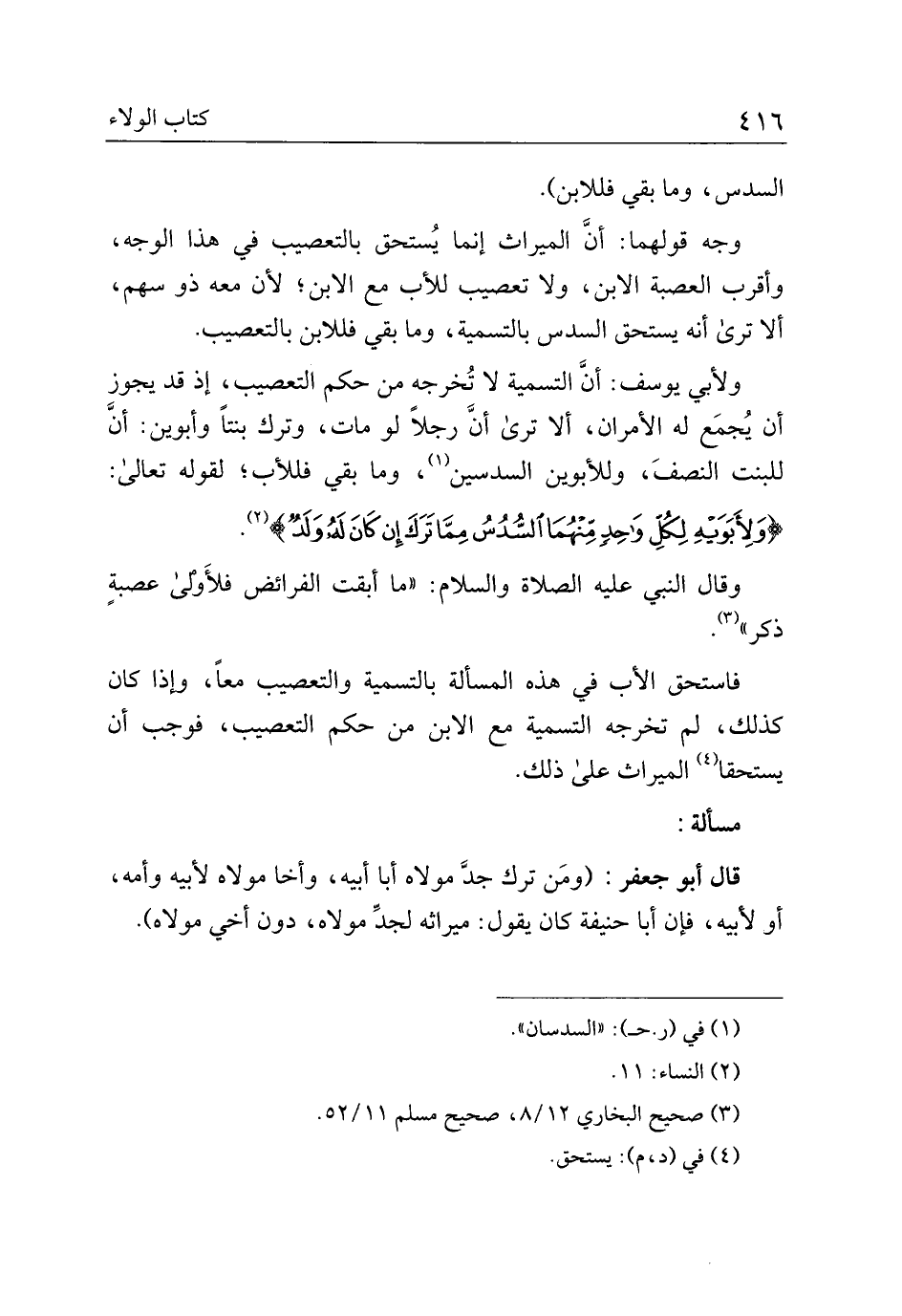 ولأبي يوسف: أن التسمية لا تخرجه من حكم التعصيب، إذ قد يجوز أن يجمع له الأمران، ألا ترى أن رجلا لو مات، وترك بنتا وأبوين: أن للبنت النصف، وللأبوين السدسين، وما بقي فللأب؛ لقوله تعالى: {ولأبويه لكل واحد منهما السدس مما ترك إن كان له ولد}.