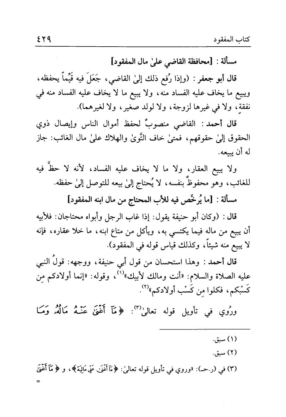 قال: (وكان أبو حنيفة يقول: إذا غاب الرجل وأبواه محتاجان: فلأبيه أن يبيع من ماله فيما يكتسي به، ويأكل من متاع ابنه، ما خلا عقاره، فإنه لا يبيع منه شيئا، وكذلك قياس قوله في المفقود).