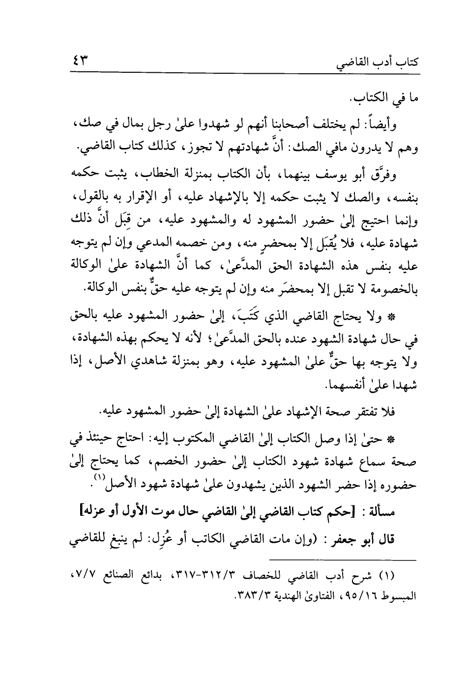 * ولا يحتاج القاضي الذي كتب إلى حضور المشهود عليه بالحق في حال شهادة الشهود عنده بالحق المدعى؛ لأنه لا يحكم بهذه الشهادة، ولا يتوجه بها حق على المشهود علي، وهو بمنزلة شاهدي الأصل، إذا شهدا على أنفسهما.