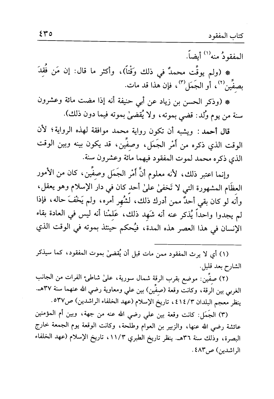 قال أحمد: ويشبه أن تكون رواية محمد موافقة لهذه الرواية؛ لأن الوقت الذي ذكره في أمر الجمل، وصفين، قد يكون بينه وبين الوقت الذي ذكره محمد لموت المفقود فيهما مائة وعشرون سنة.