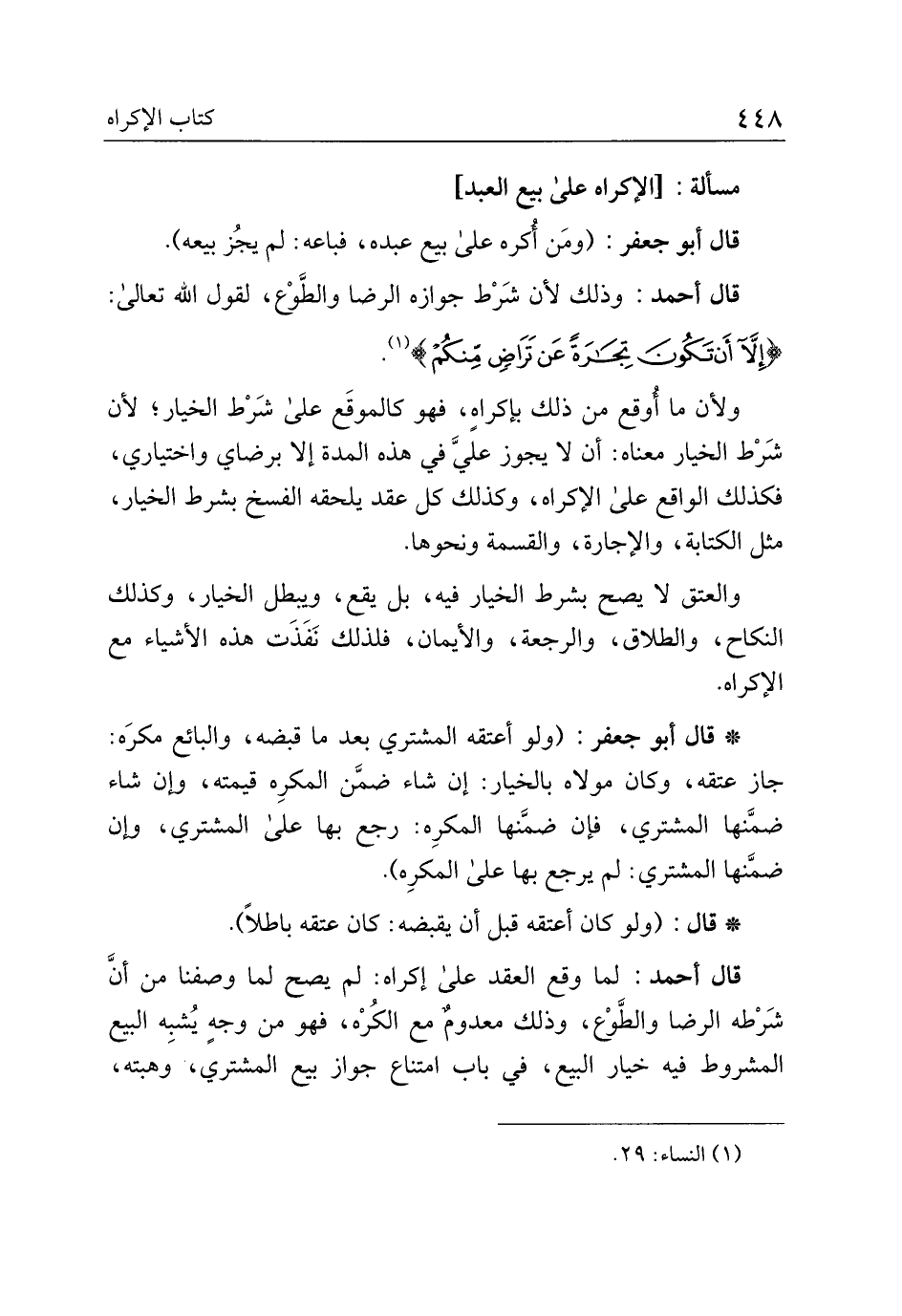 قال أحمد: لما وقع العقد على إكراه: لم يصح لما وصفنا من أن شرطه الرضا والطوع، وذلك معدوم مع الكره، فهو من وجه يشبه البيع المشروط فيه خيار البيع، في باب امتناع جواز بيع المشتري، وهبته،