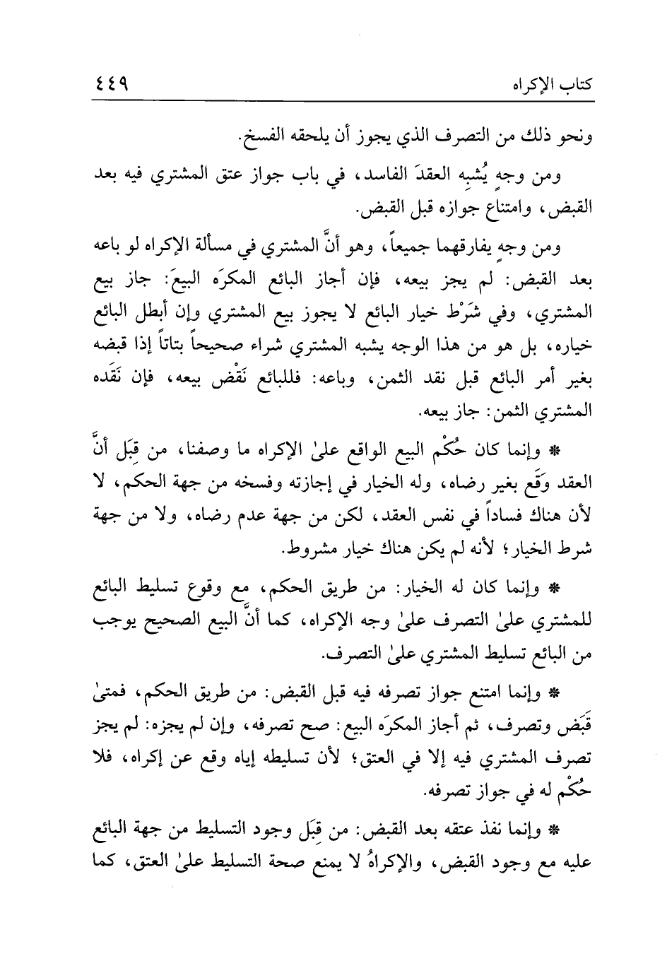 ومن وجه يفارقها جميعا، وهو أن المشتري في مسألة الإكراه لو باعه بعد القبض: لم يجز بيعه، فإن أجاز البائع المكره البيع: جاز بيع المشتري، وفي شرط خيار البائع لا يجوز بيع المشتري وإن أبطل البائع خياره، بل هو من هذا الوجه يشبه المشتري شراء صحيحا بتاتا إذا قبضه بغير أمر البائع قبل نفد الثمن، وباعه: فللبائع نقض بيعه، فإن نفده المشتري الثمن: جاز بيعه.