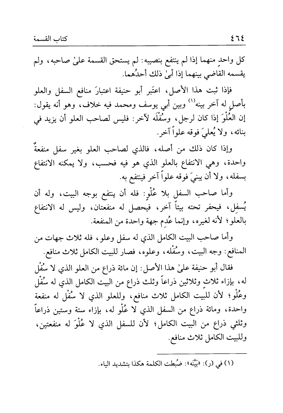 فقال أبو حنيفة على هذا الأصل: إن مائة ذراع من العلو الذي لا سفل له، بإزاء ثلاث وثلاثين ذراعا وثلث ذراع من البيت الكامل الذي له سفل وعلو؛ لأن للبيت الكامل ثلاث منافع، وللعلو الذي لا سفل له منفعة واحدة، ومائة ذراع من السفل لا علو له، بإزاء ستة وستين ذراعا وثلثي ذراع من البيت الكامل؛ لأن للسفل الذي لا علو له منفعتين، وللبيت الكامل ثلاث منافع.