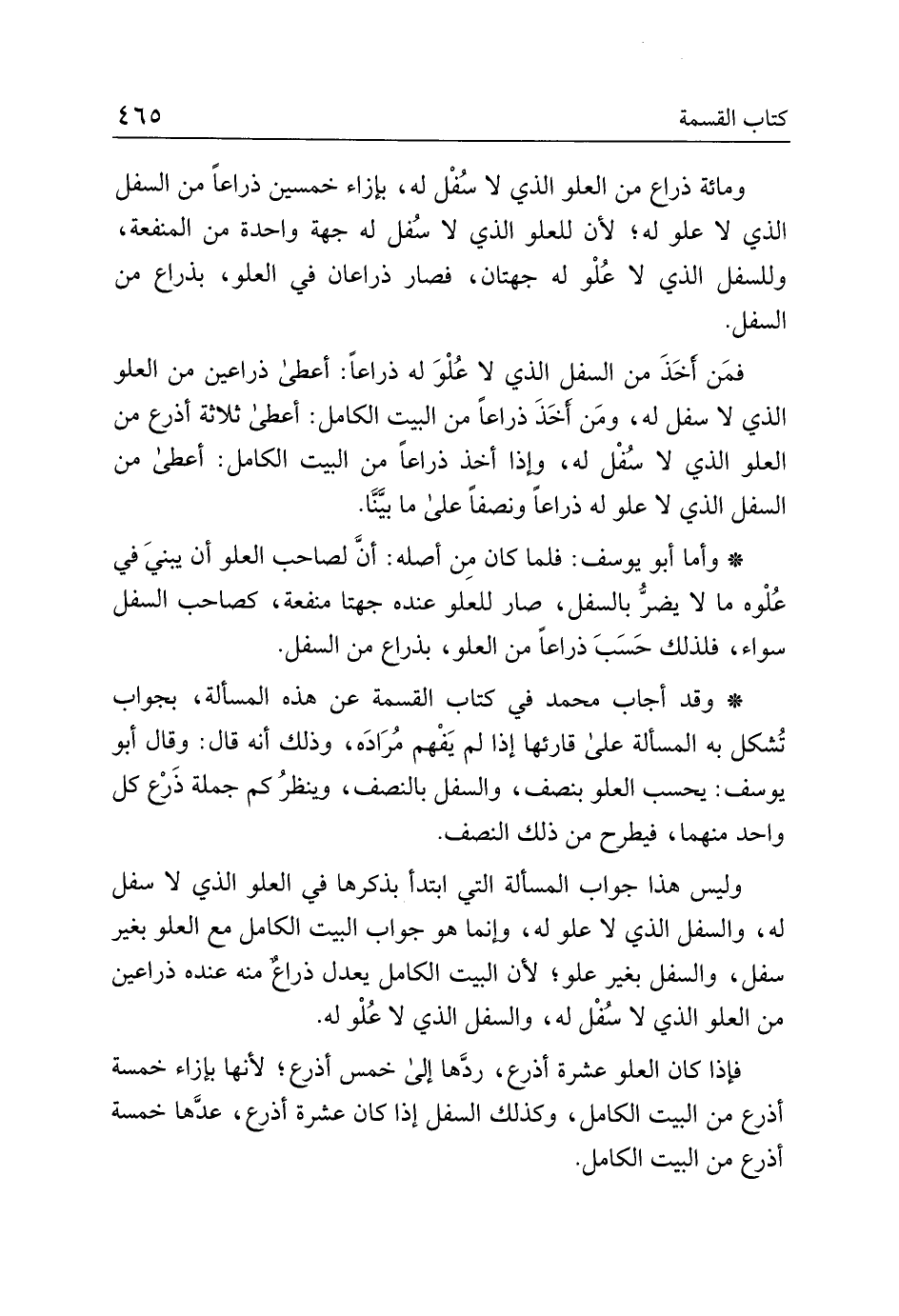 فمن أخذ من السفل الذي لا علو له ذراعا: أعطى ذراعين من العلو الذي لا سفل له، ومن أخذ ذراعا من البيت الكامل: أعطى ثلاثة أذرع من العلو الذي لا سفل له، وإذا أخذ ذراعا من البيت الكامل: أعطى من السفل الذي لا علو له ذراعا ونصفا على ما بينا.
