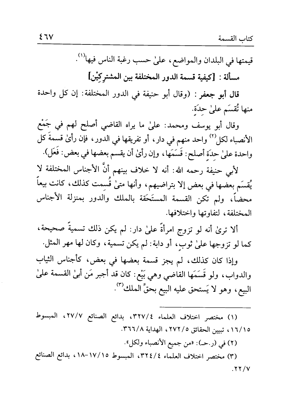 قال أبو جعفر: (وقال أبو حنيفة في الدور المختلفة: إن كل واحدة منها تقسم على حدة.
