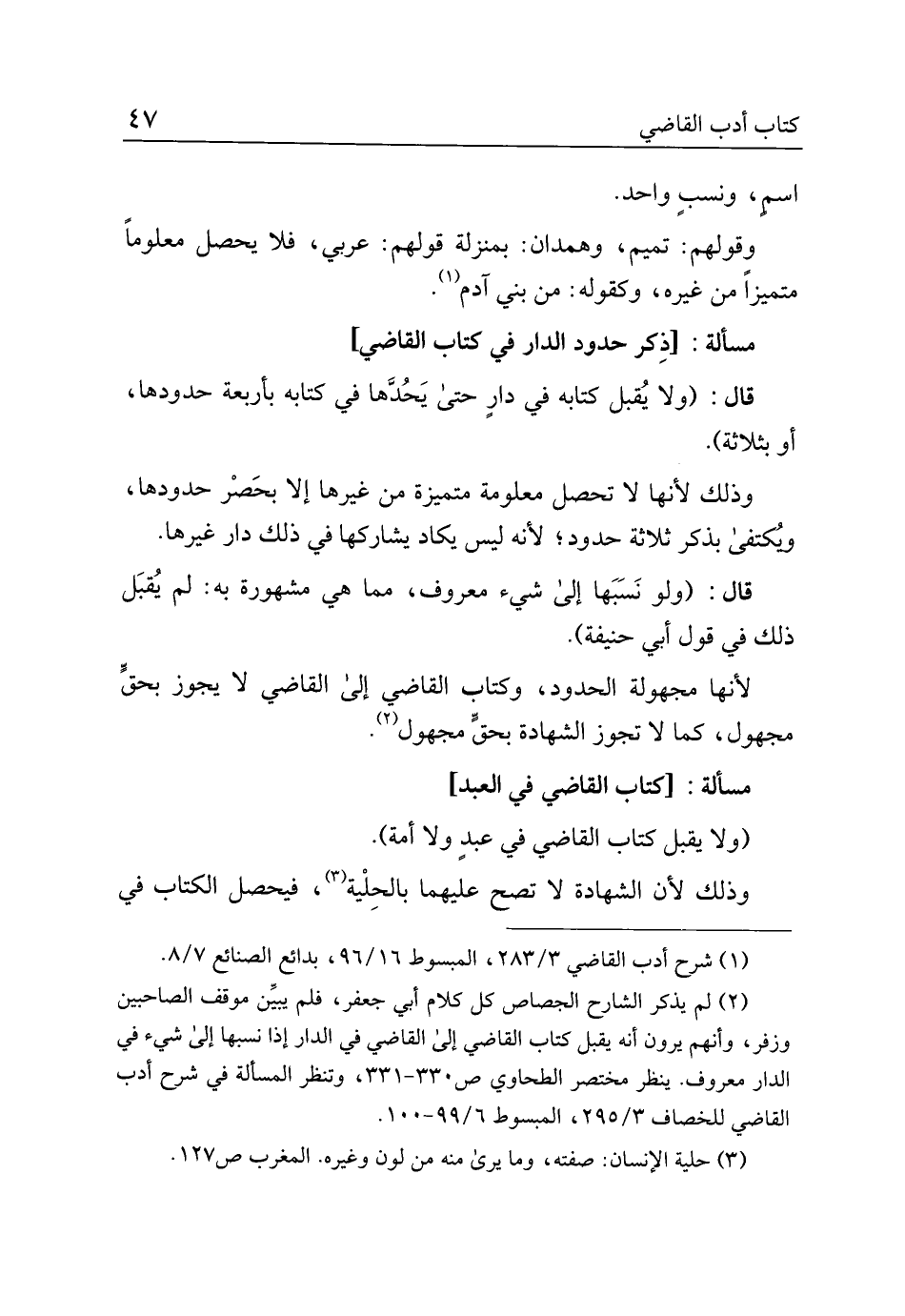 قال: (ولا يقبل كتابه في دار حتى يحدها في كتابه بأربعة حدودها، أو بثلاثة).