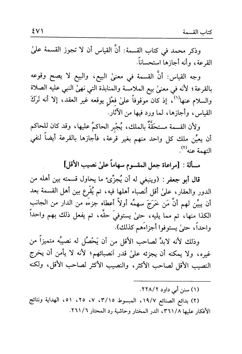 قال أبو جعفر: (وينبغي له أن يجزئ ما يحاول قسمته بين أهله من الدور والعقار، على أقل أنصباء أهلها فيه، ثم يقرع بين أهل القسمة بعد أن يبين لهم أن من خرج سهمه أولا أعطاه جزءه من الدار من الجانب الكذا منها، ثم مما يليه، حتى يستوفي حقه، ثم يفعل ذلك بهم واحدا واحدا، حتى يستوفوا أجزاءهم كذلك).