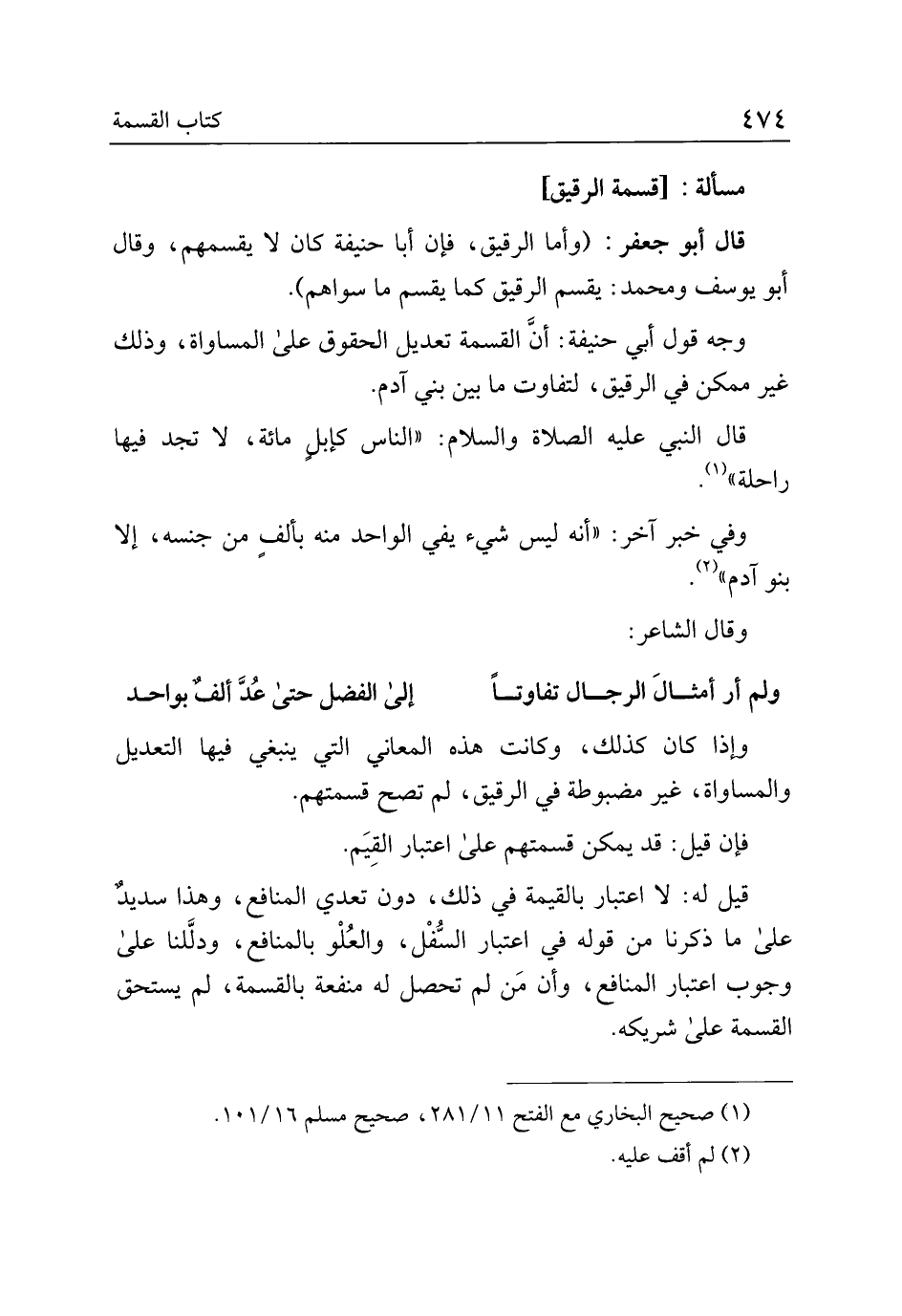 قال أبو جعفر: (وأما الرقيق، فإن أبا حنيفة كان لا يقسمهم، وقال أبو يوسف ومحمد: يقسم الرقيق كما يقسم ما سواهم).