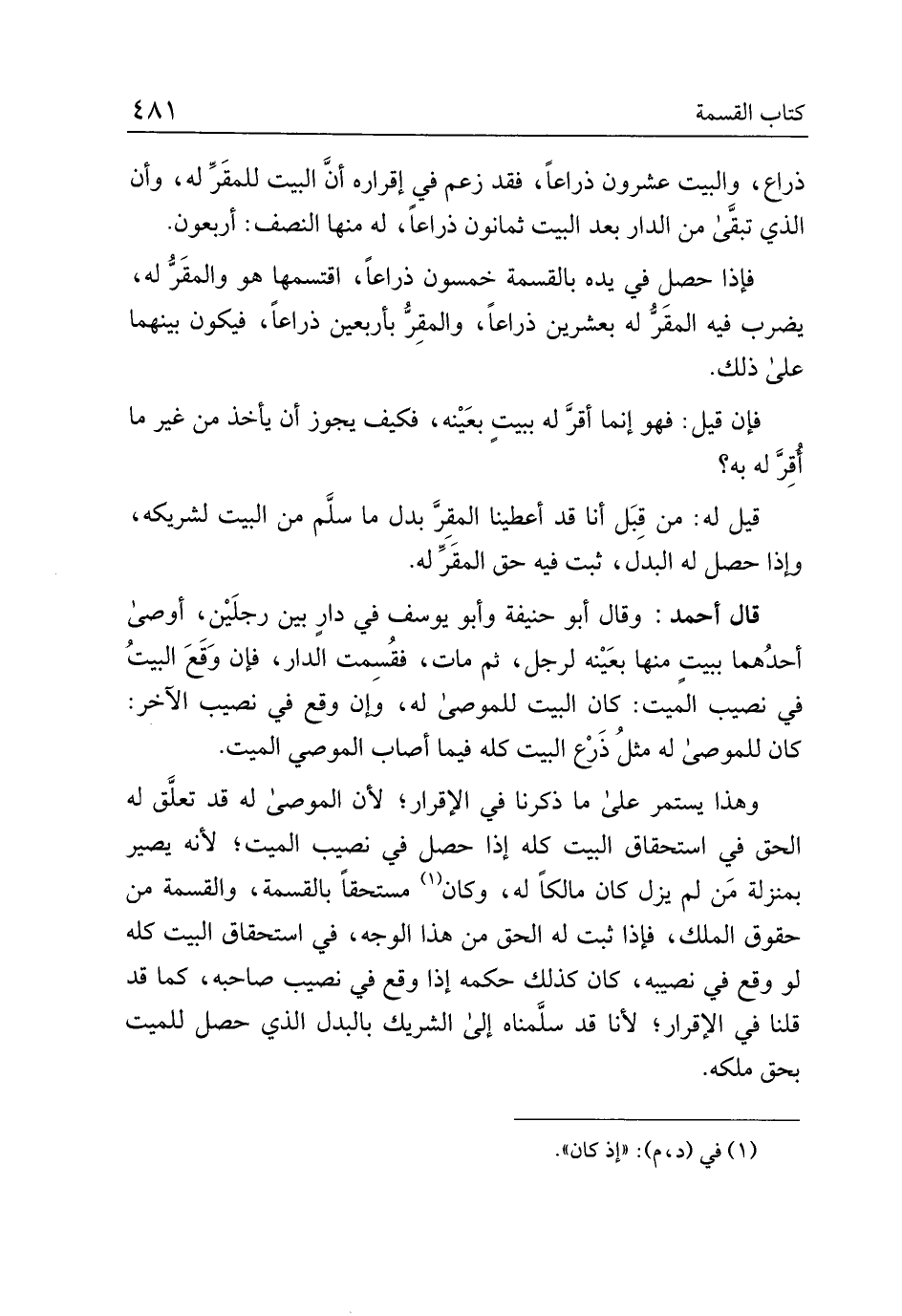 قال أحمد: وقال أبو حنيفة وأبو يوسف في دار بين رجلين، أوصى أحدهما ببيت منها بعينه لرجل، ثم مات، فقسمت الدار، فإن وقع البيت في نصيب الميت: كان البيت للموصى له، وإن وقع في نصيب الآخر: كان للموصى له مثل ذرع البيت كله فيما أصاب الموصي الميت.
