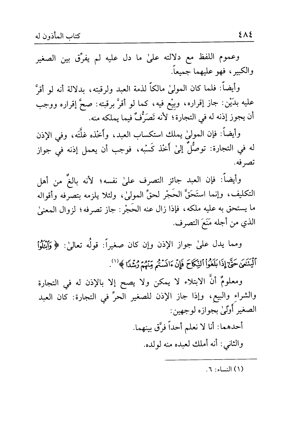 ومعلوم أن الابتلاء لا يمكن ولا يصح إلا بالإذن له في التجارة والشراء والبيع، وإذا جاز الإذن للصغير الحر في التجارة: كان العبد الصغير أولى بجوازه لوجهين: