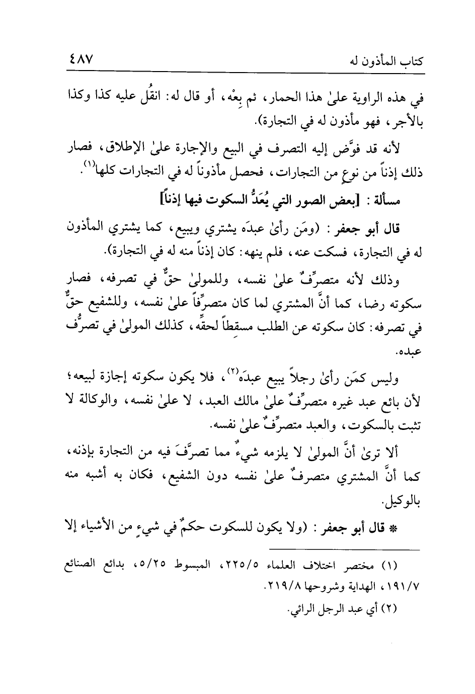 قال أبو جعفر: (ومن رأى عبده يشتري ويبيع، كما يشتري المأذون له في التجارة، فسكت عنه، فلم ينهه: كان إذنا منه له في التجارة).