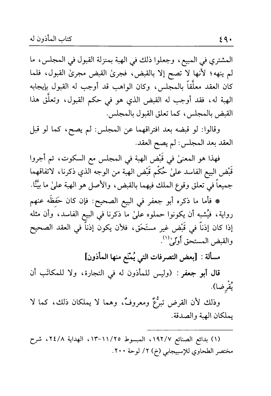 المشتري في المبيع، وجعلوا ذلك في الهبة بمنزلة القبول في المجلس، ما لم ينهه؛ لأنها لا تصح إلا بالقبض، فجرى القبض مجرى القبول، فلما كان العقد معلقا بالمجلس، وكان الواهب قد أوجب له القبول بإيجابه الهبة له، فقد أوجب له القبض الذي هو في حكم القبول، وتعلق هذا القبض بالمجلس، كما تعلق القبول بالمجلس.