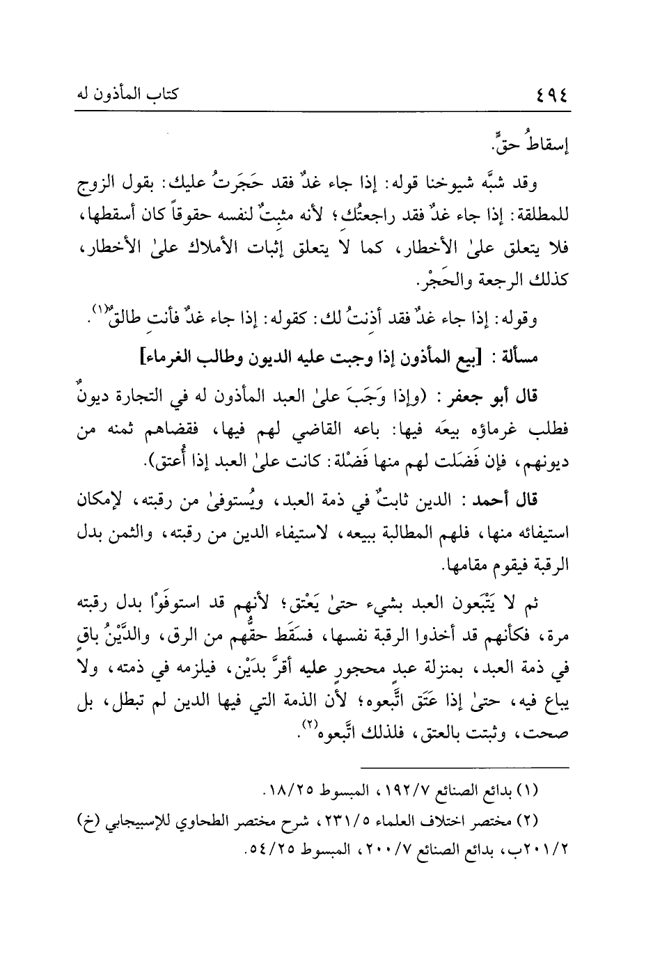 وقد شبه شيوخنا قوله: إذا جاء غد فقد حجرت عليك: بقول الزوج للمطلقة: إذا جاء غد فقد راجعتك؛ لأنه مثبت لنفسه حقوقا كان أسقطها، فلا يتعلق على الأخطار، كما لا يتعلق إثبات الأملاك على الأخطار، كذلك الرجعة والحجر.