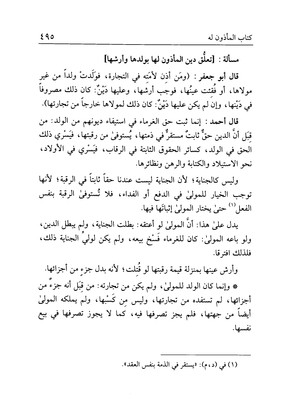 قال أحمد: إنما ثبت حق الغرماء في استيفاء ديونهم من الولد: من قبل أن الدين حق ثابت مستقر في ذمتها، يستوفى من رقبتها، فيسري ذلك الحق في الولد، كسائر الحقوق الثابتة في الرقاب، فيسري في الأولاد، نحو الاستيلاد والكتابة والرهن ونظائرها.