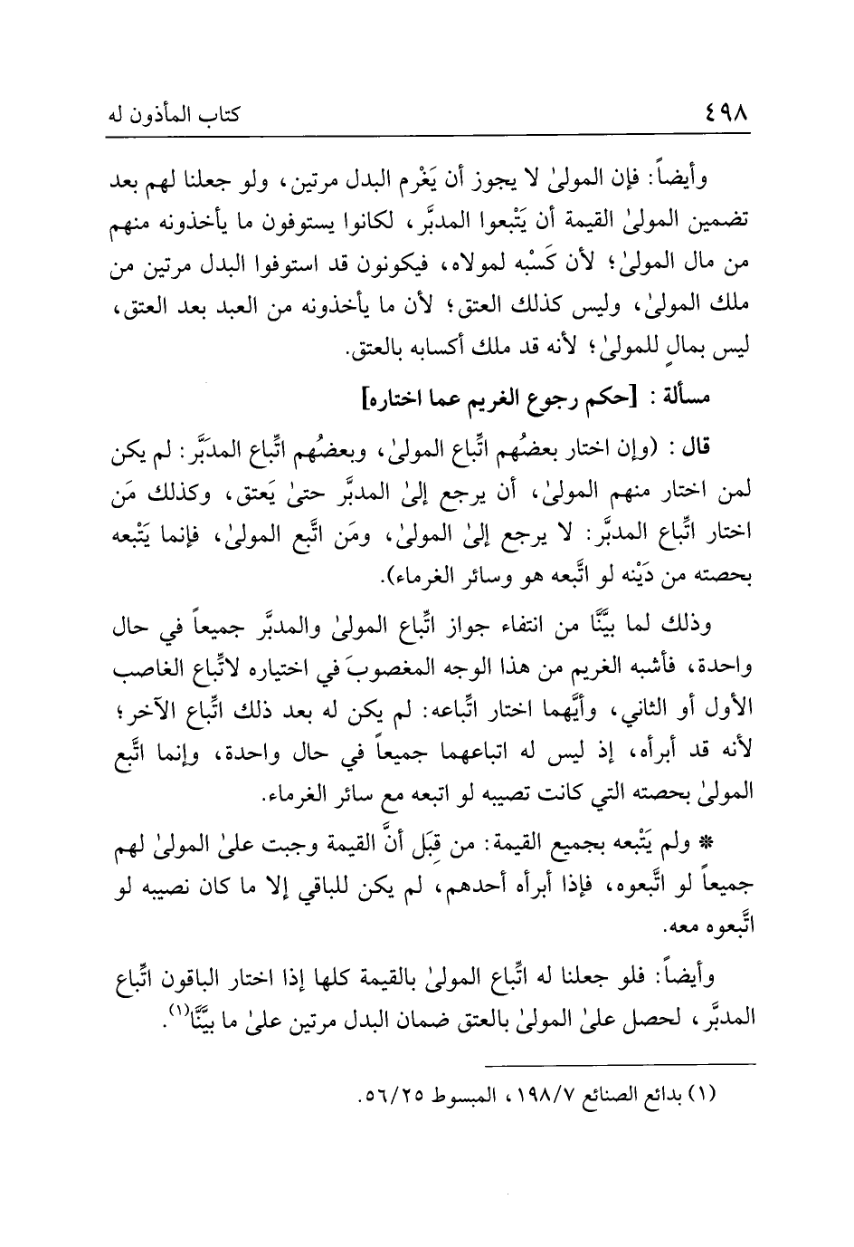 وذلك لما بينا من انتفاء جواز اتباع المولى والمدبر جميعا في حال واحدة، فأشبه الغريم من هذا الوجه المغصوب في اختياره لاتباع الغاصب الأول أو الثاني، وأيهما اختار اتباعه: لم يكن له بعد ذلك اتباع الآخر؛ لأنه أبرأه، إذ ليس له اتباعهما جميعا في حال واحدة، وإنما اتبع المولى بحصته التي كانت تصيبه لو اتبعه مع سائر الغرماء.