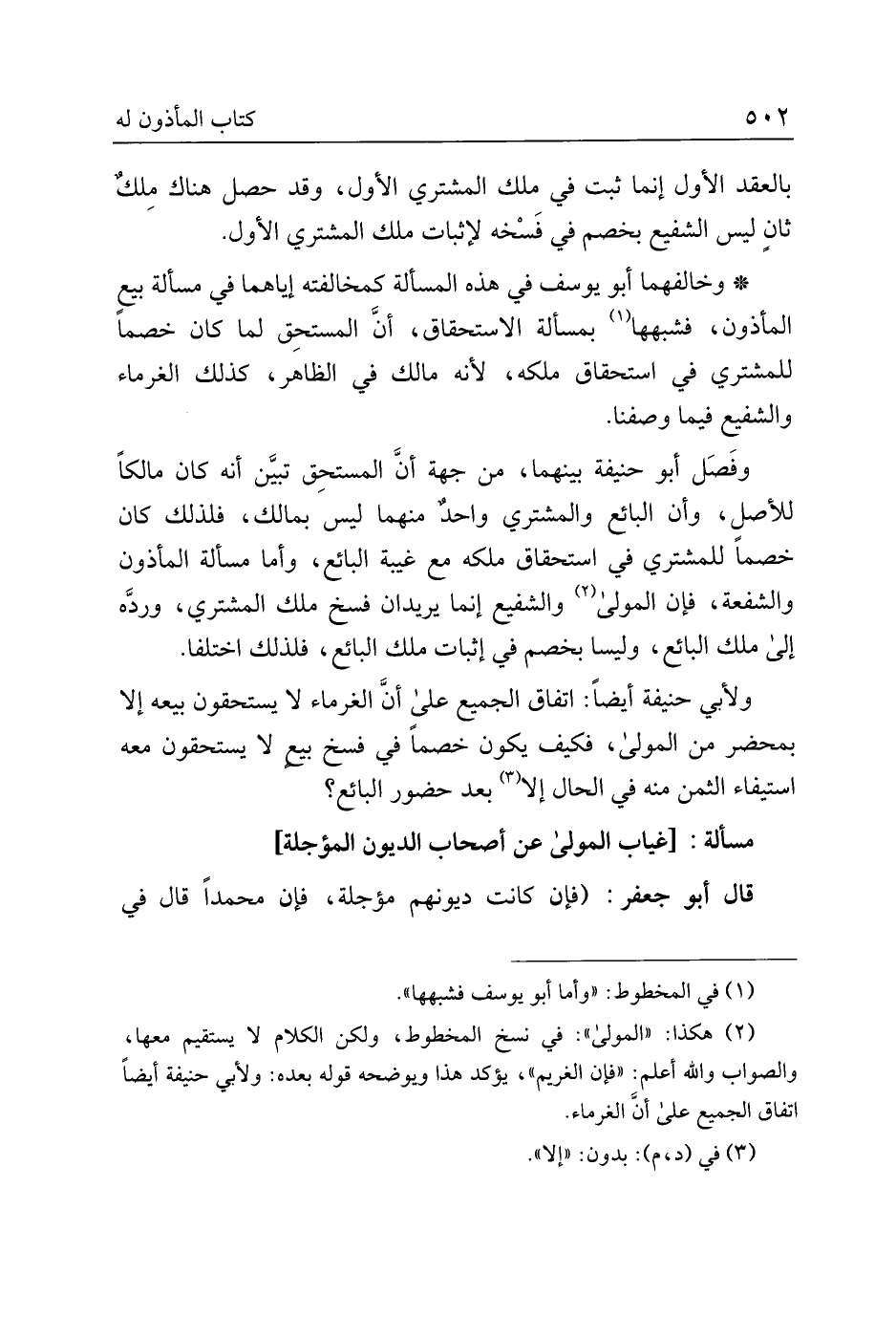 *وخالفهما أبو يوسف في هذه المسألة كمخالفته إياهما في مسألة بيع المأذون، فشبهها بمسألة الاستحقاق، أن المستحق لما كان خصما للمشتري في استحقاق ملكه، لأنه مالك في الظاهر، كذلك الغرماء والشفيع فيما وصفنا.