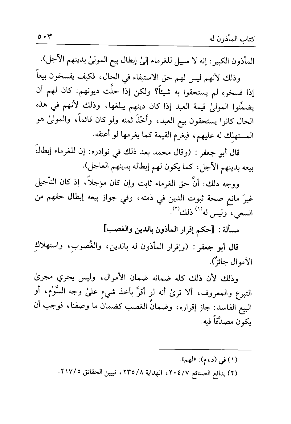 المأذون الكبير: إنه لا سبيل للغرماء إلى إبطال بيع المولى بدينهم الأجل).