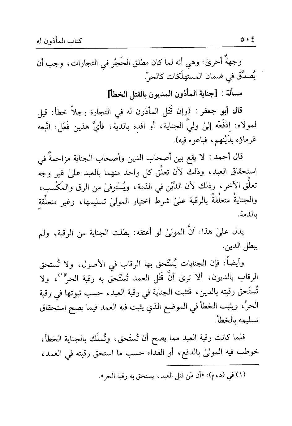 قال أبو جعفر: (وإن قتل المأذون له في التجارة رجلا خطأ: قيل لمولاه: ادفعه إلى ولي الجناية، أو افده بالدية، فأي هذين فعل: اتبعه غرماؤه بدينهم، فباعوه فيه).