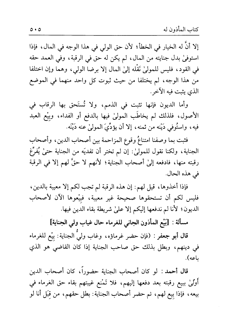 قال أحمد: لو كان أصحاب الجناية حضورا، كان أصحاب الدين أولى ببيع رقبته بعد دفعها إليهم، فلا تمنع غيبتهم بقاء حق الغرماء في بيعه، فإذا بيع لهم، ثم حضر أصحاب الجناية: بطل حقهم، من قبل أنا لو