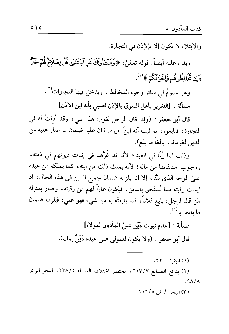 قال أبو جعفر: (وإذا قال الرجل لقوم: هذا ابني، وقد أذنت له في التجارة، فبايعوه، قم ثبت أنه ابن لغيره: كان عليه ضمان ما صار عليه من الدين لغرمائه، بالغا ما بلغ).