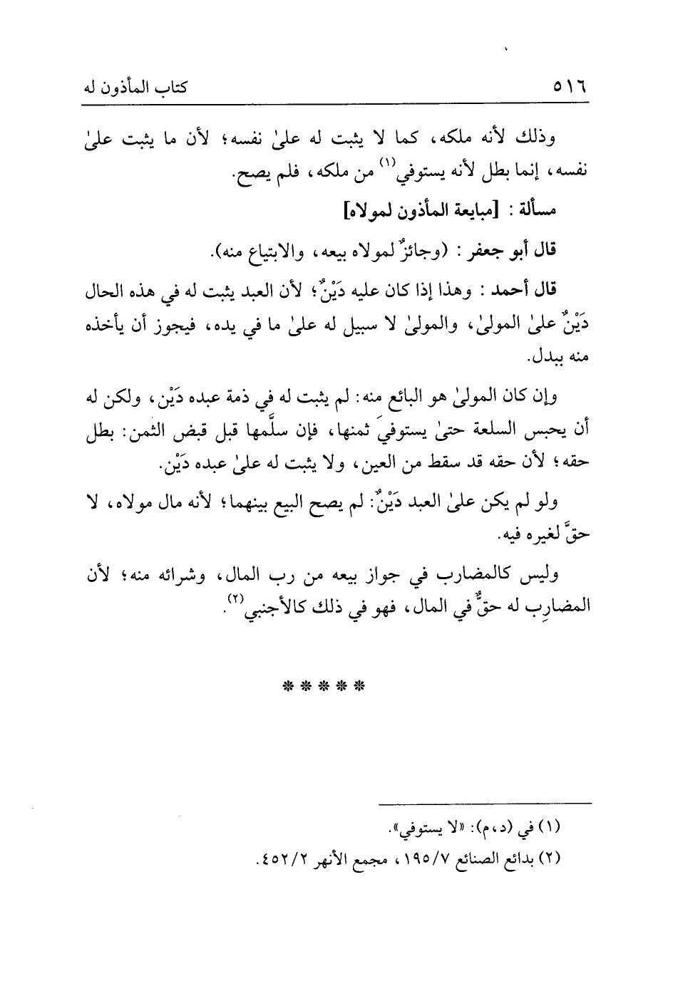 قال أبو جعفر: (وجائز لمولاه بيعه، والابتياع منه).