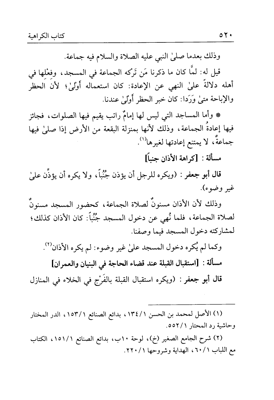 قال أبو جعفر: (ويكره استقبال القبلة بالفرج في الخلاء في المنازل