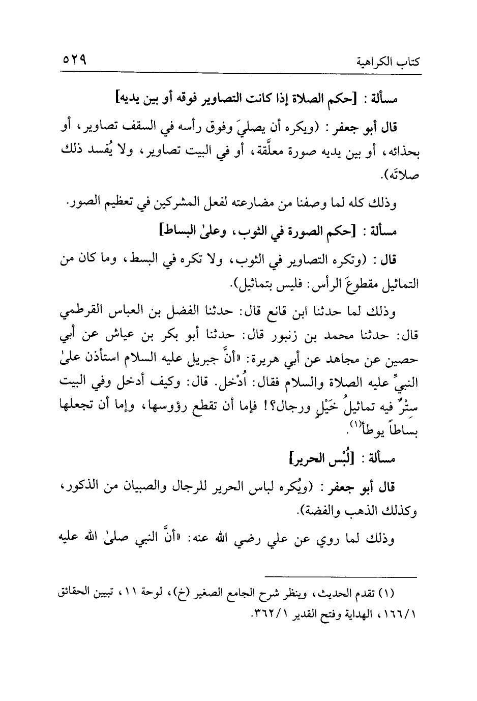 وذلك لما حدثنا ابن قانع قال: حدثنا الفضل بن العباس القرطمي قال: حدثنا محمد بن زنبور قال: حدثنا أبو بكر بن عياش عن أبي حصين عن مجاهد عن أبي هريرة: "أن جبريل عليه السلام استأذن على النبي عليه الصلاة والسلام فقال: ادخل. قال: وكيف أدخل وفي البيت ستر فيه تماثيل خيل ورجال؟! فإما أن تقطع رؤوسها، وإما أن تجعلها بساطا يوطأ.