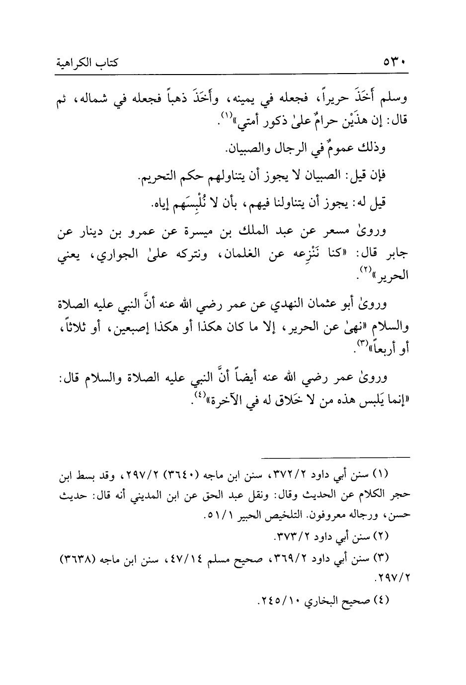 وروى أبو عثمان النهدي عن عمر رضي الله عنه أن النبي عليه الصلاة والسلام "نهى عن الحرير، إلا ما كان هكذا أو هكذا إصبعين، او ثلاثا، أو اربعا".