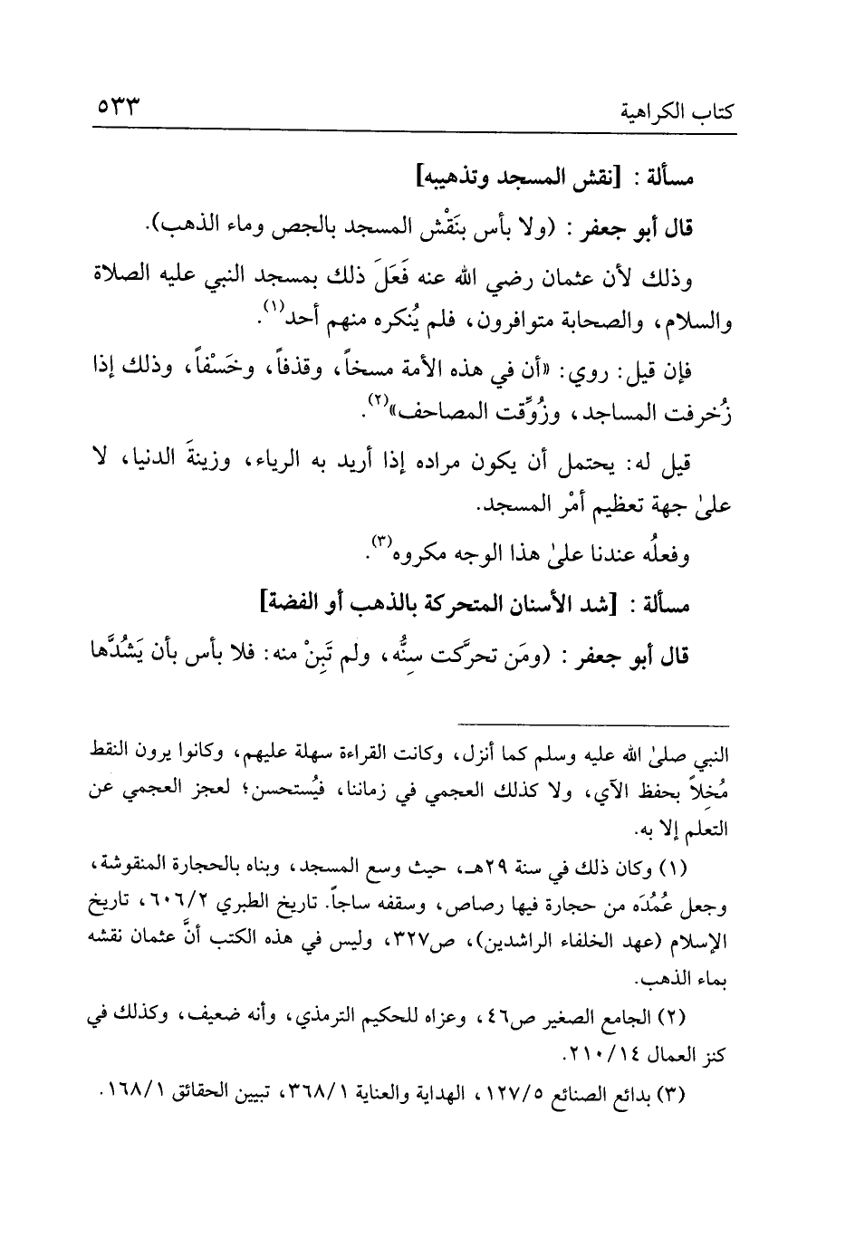 قال أبو جعفر: (ولا بأس بنقش المسجد بالجص وماء الذهب).