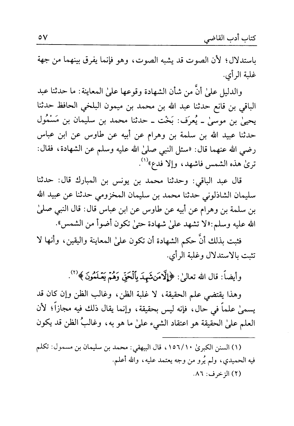 فثبت بذلك أن حكم الشهادة أن تكون على المعاينة واليقين، وأنها لا تثبت بالاستدلال وغلبة الرأي.