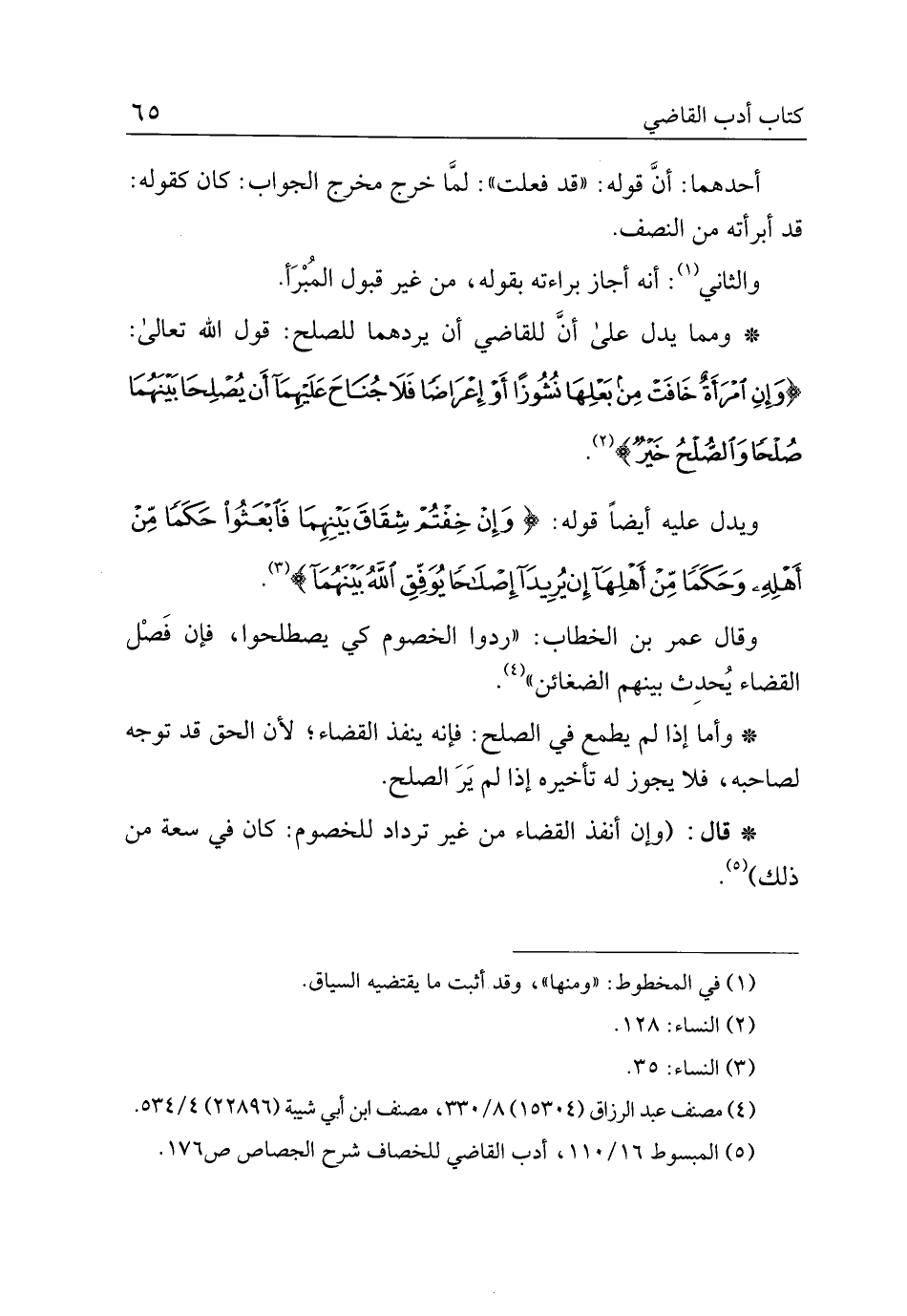 * ومما يدل على أن للقاضي أن يردهما للصلح: قول الله تعالى: {وإن امرأة خافت من بعلها نشوزًا أو إعراضًا فلا جناح عليهما أن يصلحا بينهما صلحًا والصلح خير}.
