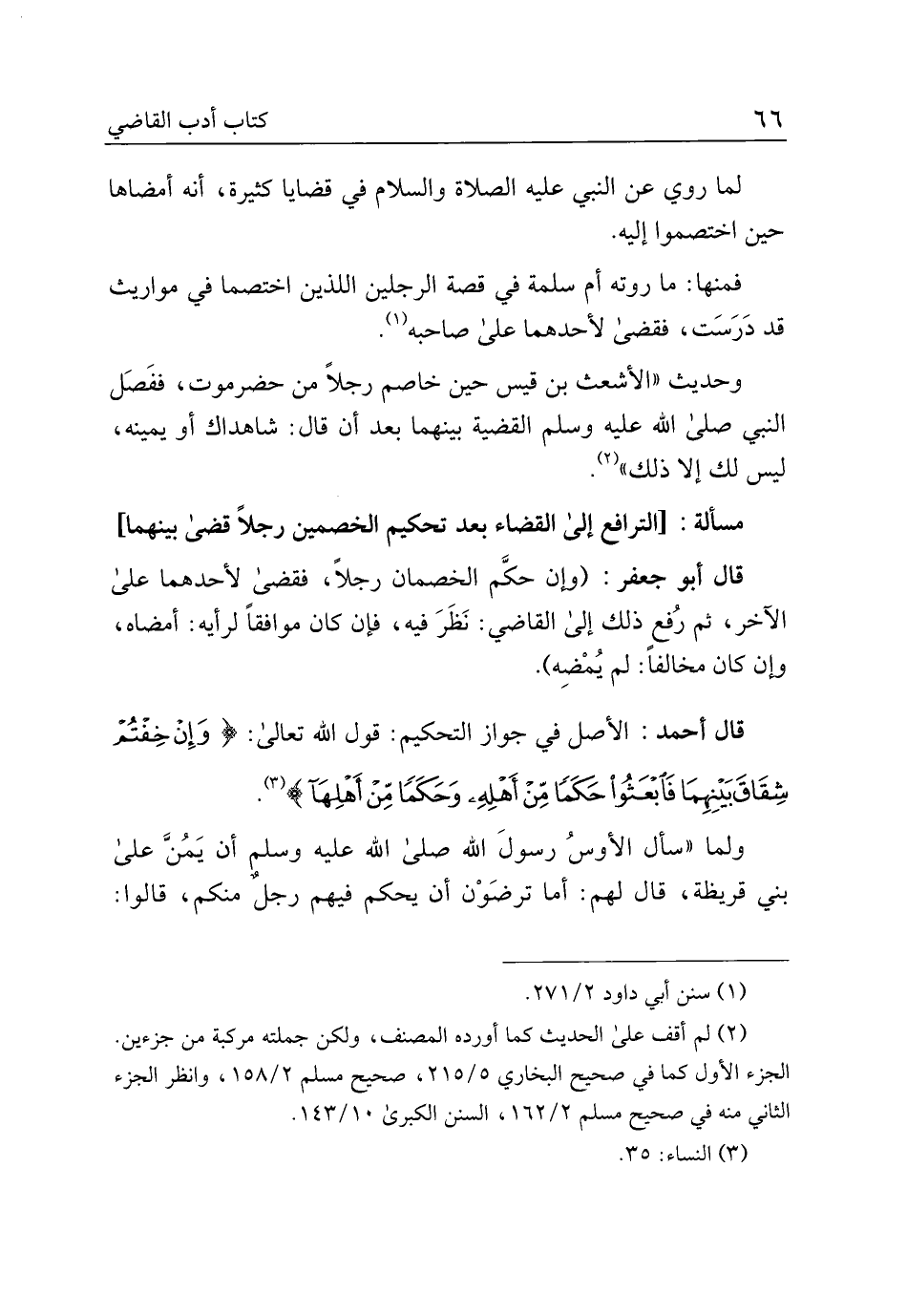 قال أحمد: الأصل في جواز التحكيم: قول الله تعالى: {وإن خفتم شقاق بينهما فابعثوا حكمًا من أهله وحكمًا من أهلها}.
