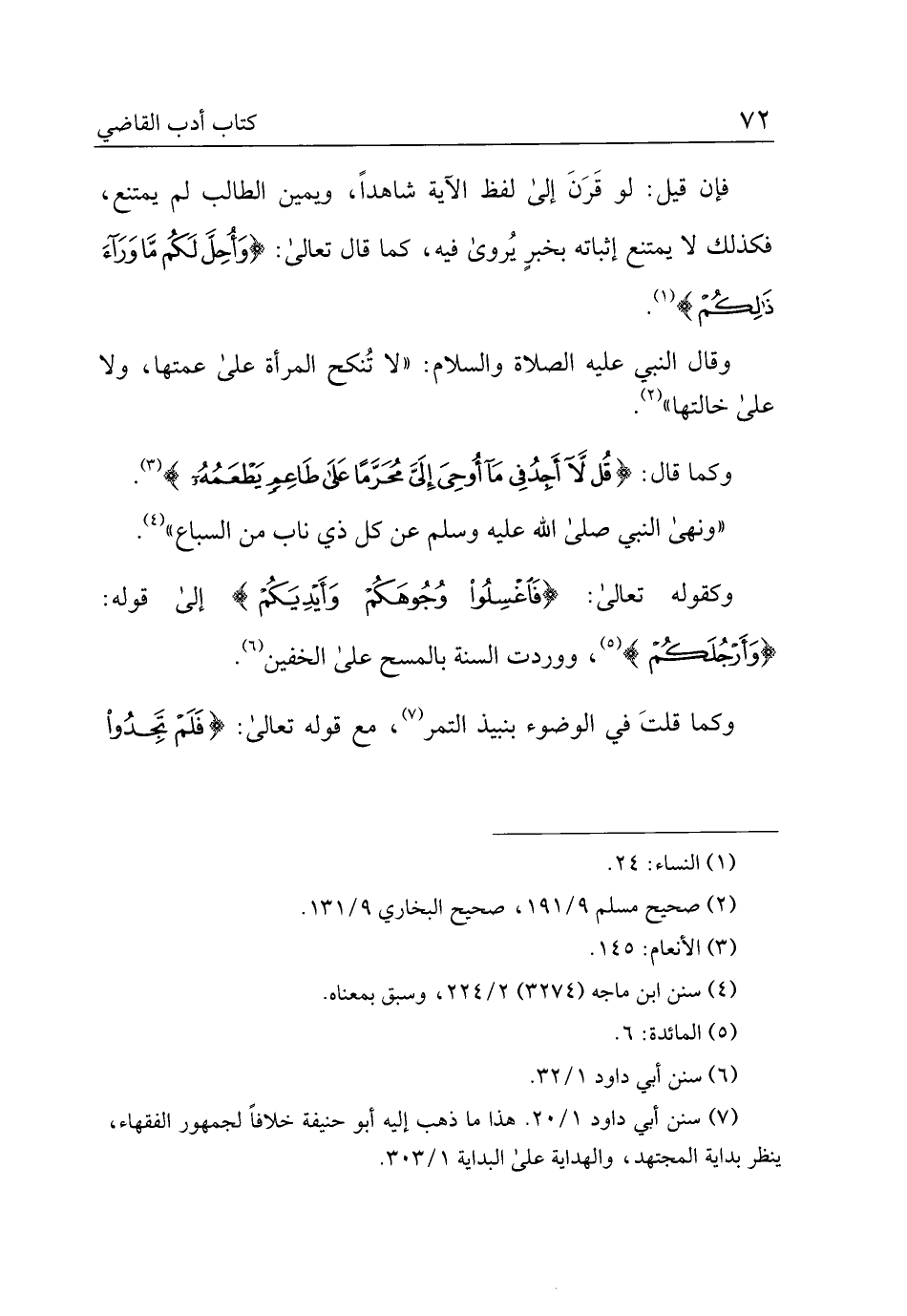 وكقوله تعالى: {فاغسلوا وجوهكم وأيديكم" إلى قوله: {وأرجلكم}، ووردت السنة بالمسح على الخفين.