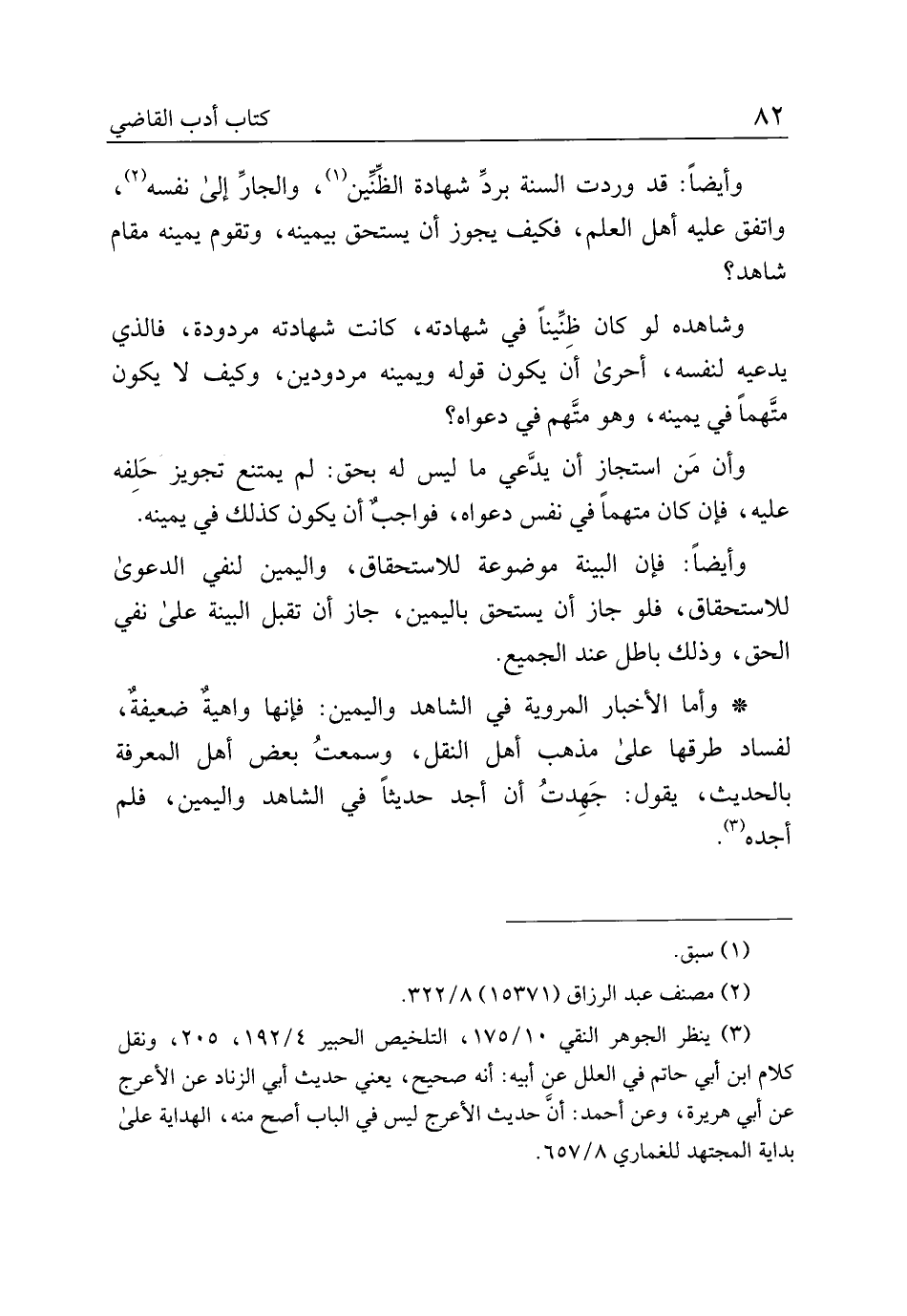 * وأما الأخبار المروية في الشاهد واليمين: فإنها واهية ضعيفة، لفساد طرقها على مذهب أهل النقل، وسمعت بعض أهل المعرفة بالحديث، يقول: جهدت أن أجد حديثًا في الشاهد واليمين، فلم أجده.