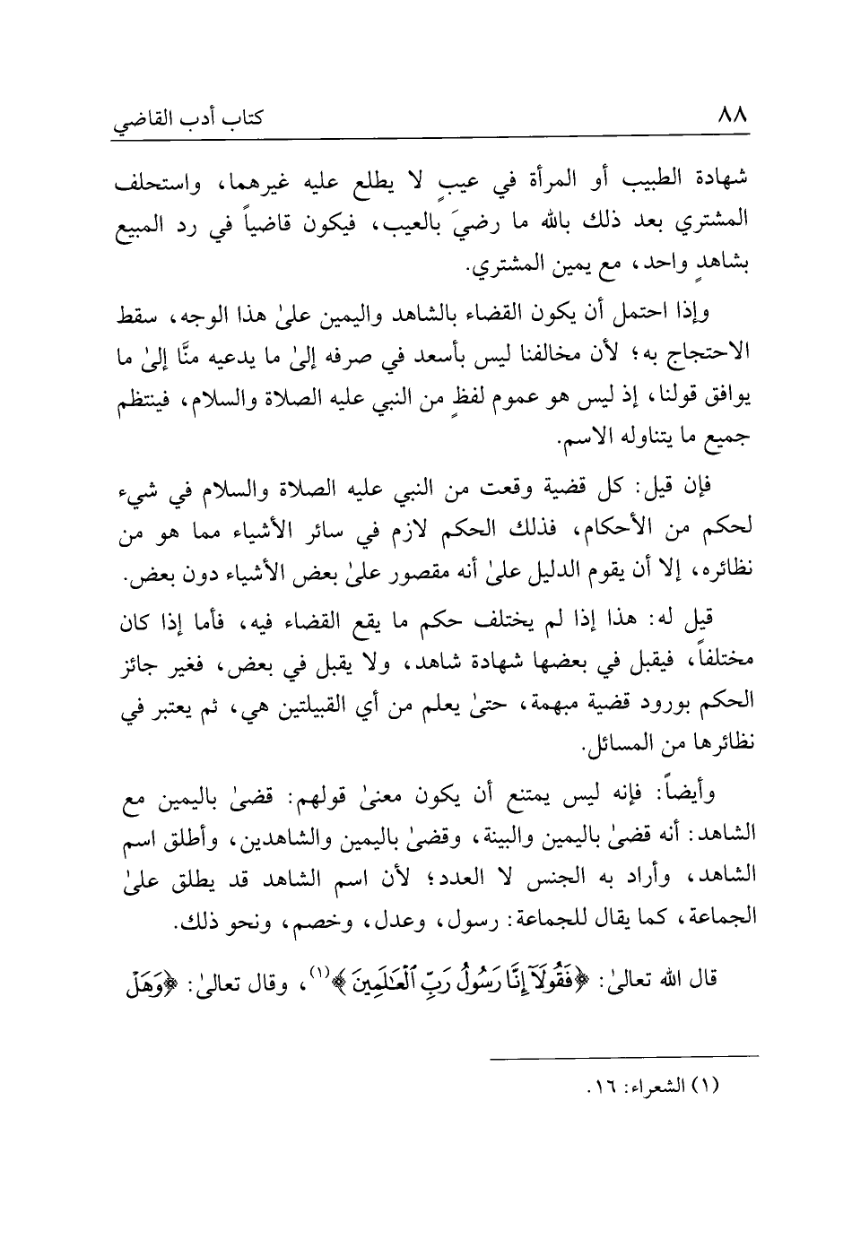 قيل له: هذا إذا لم يختلف حكم ما يقع القضاء فيه، فأما إذا كان مختلفًا، فيقبل في بعضها شهادة شاهد، ولا يقبل في بعض، فغير جائز الحكم بورود قضية مبهمة، حتى يعلم من أي القبيلتين هي، ثم يعتبر في نظائرها من المسائل.