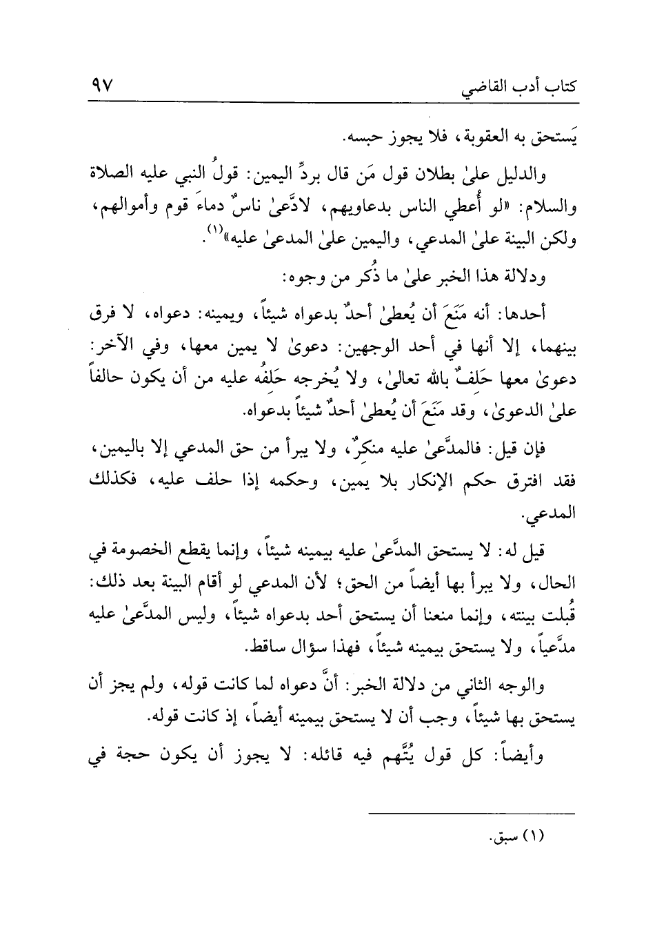 والدليل على بطلان قول من قال برد اليمين: قول النبي عليه الصلاة والسلام: "لو أعطي الناس بدعاويهم، لادعى ناس دماء قوم وأموالهم، ولكن البينة على المدعي، واليمين على المدعى عليه".