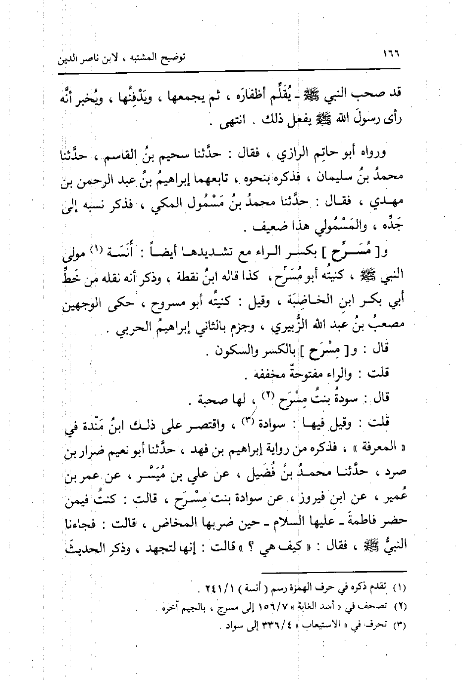 وَذكره أَبُو بكر ابْن نقطة: بِضَم الْمِيم، وَفتح السِّين الْمُهْملَة، وَتَشْديد الرَّاء وَفتحهَا، فعطفه على شيخ ابْن الْمُقْرِئ الْمَذْكُور آنِفا، فَقَالَ: ومسرح أَبُو رميل الْأَشْعَرِيّ، لَهُ من النَّبِي صلى الله عَلَيْهِ وَسلم رُؤْيَة، رَوَت عَنهُ ابْنَته ميل، وَهَكَذَا نقلته من ((معرفَة الصَّحَابَة)) لأبي نعيم وَمن خطه بِالسِّين الْمُهْملَة، وَالرَّاء الْمُشَدّدَة، وَكَذَلِكَ أخرجه مُحَمَّد بن إِسْمَاعِيل البُخَارِيّ فِي ((تَارِيخه)) فِي بَاب الْوَاحِد من حرف الْمِيم، وَذكر بعده مشرح بن هاعان، فَلَو اسْتَويَا عِنْده فِي الضَّبْط، لم يخرجهما فِي بَاب الْوَاحِد. انْتهى قَول ابْن نقطة، وَفِيه نطر من وَجْهَيْن: