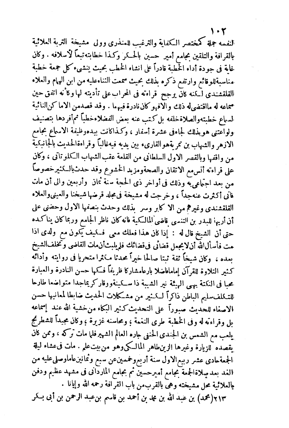 التقي أَبُو الْفضل بن الْعَفِيف بن التقي الْقرشِي الْعَدوي الغمري الحراري الْمَالِكِي. قَالَ الفاسي حضر على عَمه فِيمَا أَحسب وَسمع من ابْن صديق وَغَيره وعني بِالْعلمِ فَتنبه وَدخل الْيمن والهند طلبا للرزق فأدركه أَجله بكلبرجة بِبِلَاد الْهِنْد فِي سنة عشر عَن نَيف وَثَلَاثِينَ سنة وَوصل نعيه لمَكَّة فِي سنة أَربع عشرَة. مُحَمَّد الْجمال بن الْعَفِيف أَخُو الَّذِي قبله. ولد فِي صثفر سنة خمس وَتِسْعين وَسَبْعمائة بِمَكَّة وَسمع بهَا من الْبُرْهَان بن صديق صَحِيح البُخَارِيّ بفوت وَأَجَازَ لَهُ جمَاعَة كَابْن أبي الْبَقَاء وَابْن الناصح والكمال الدَّمِيرِيّ والعراقي والهيثمي، وَدخل فِي التِّجَارَة لليمن وجزيرة سواكن. وَمَات بهَا فِي الْعشْر الأول من صفر سنة إِحْدَى وَأَرْبَعين، ذكره النَّجْم عمر بن فَهد فِي مُعْجَمه وذيله. مُحَمَّد بن عبد الله بن مُحَمَّد بن أَحْمد بن مُجَاهِد بن يُوسُف بن مُحَمَّد بن أَحْمد بن عَليّ الشَّمْس أَبُو عبد الله بن أبي بكر الْقَيْسِي الْحَمَوِيّ الأَصْل الدِّمَشْقِي الشَّافِعِي وَيعرف بِابْن نَاصِر الدّين. ولد فِي الْعشْر الأول من الْمحرم سنة سبع وَسبعين وَسَبْعمائة بِدِمَشْق وَنَشَأ بهَا فحفظ الْقُرْآن وعدة مختصرات واشتغل قَلِيلا وَحصل وَفضل وتفقه واعتنى بِهَذَا الشَّأْن وَتخرج فِيهِ بِابْن الشرائحي ولازمه مُدَّة وَكَذَا انْتفع فِي الطّلب بمرافقة الصّلاح الأقفهسي وَحمل عَن شُيُوخ بَلَده والقادمين إِلَيْهَا بقرَاءَته وَقِرَاءَة غَيره الْكثير وَكتب الطباق وارتحل لبعلبك وَغَيرهَا، وسافر بِأخرَة صُحْبَة تِلْمِيذه النَّجْم بن فَهد الْمَكِّيّ إِلَى حلب وَقَرَأَ على حافظها الْبُرْهَان بعض الْأَجْزَاء وَكَذَا سمع من ابْن خطيب الناصرية وَحج قبل ذَلِك وَسمع بِمَكَّة من الْجمال بن ظهيرة وَغَيرهَا بهَا وَكَذَا بِالْمَدِينَةِ النَّبَوِيَّة وَمَا تيسرت لَهُ الرحلة إِلَى الديار المصرية وأتقن هَذَا الْفَنّ حَتَّى صَار الْمشَار إِلَيْهِ فِيهِ بِبَلَدِهِ وَمَا حولهَا وَخرج وَأفَاد ودرس وَأعَاد وَأفْتى وانتقى وتصدى لنشر الحَدِيث فَانْتَفع بِهِ النَّاس، وَحدث بالكثير فِي بَلَده وحلب وَغَيرهَا من الْبِلَاد بل حدث هُوَ وَشَيخنَا مَعًا فِي دمشق بقرَاءَته بِجُزْء أبي الجهم وَامْتنع شَيخنَا من ذَلِك إِلَّا إِن أخبر الْجَمَاعَة بِسَنَدِهِ فَمَا أمكنته الْمُخَالفَة وَلكنه اقْتصر على الْأَخْبَار)