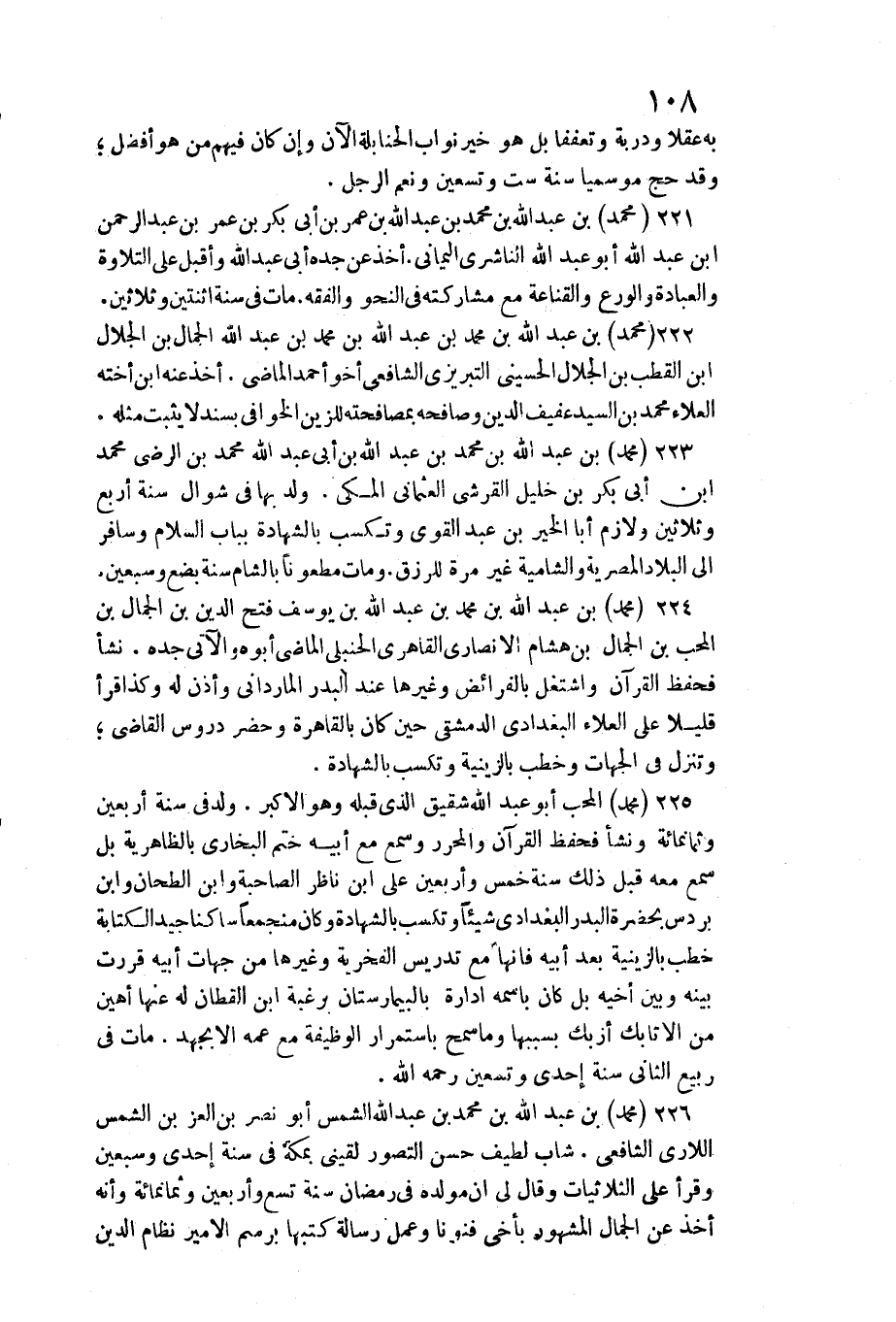 بِهِ عقلا ودربة وَتَعَفُّفًا بل هُوَ خير نواب الْحَنَابِلَة الْآن وَإِن كَانَ فيهم من هُوَ أفضل وَقد حج موسميا سنة سِتّ وَتِسْعين وَنعم الرجل. مُحَمَّد بن عبد الله بن مُحَمَّد بن عبد الله بن عمر بن أبي بكر بن عمر بن عبد الرَّحْمَن بن عبد الله أَبُو عبد الله النَّاشِرِيّ الْيَمَانِيّ. أَخذ عَن جده أبي عبد الله وَاقْبَلْ على التِّلَاوَة وَالْعِبَادَة والورع والقناعة مَعَ مشاركته فِي النَّحْو وَالْفِقْه. مَاتَ فِي سنة اثْنَتَيْنِ وَثَلَاثِينَ. مُحَمَّد بن عبد الله بن مُحَمَّد بن عبد بن بن مُحَمَّد بن عبد الله الْجمال بن الْجلَال بن القطب بن الْجلَال الْحُسَيْنِي التبريزي الشَّافِعِي أَخُو أَحْمد الْمَاضِي. أَخذ عَنهُ ابْن أُخْته الْعَلَاء مُحَمَّد بن السَّيِّد عفيف الدّين وَصَافحهُ بمصافحته للزين الخوافي بِسَنَد لَا يثبت مثله. مُحَمَّد بن عبد الله بن مُحَمَّد بن عبد الله بن أبي عبد الله مُحَمَّد بن الرضي مُحَمَّد بن أبي بكر بن خَلِيل الْقرشِي العثماني الْمَكِّيّ. ولد بهَا فِي شَوَّال سنة أَربع وَثَلَاثِينَ ولازم أَبَا الْخَيْر بن عبد الْقوي وتكسب بِالشَّهَادَةِ بِبَاب السَّلَام وسافر إِلَى الْبِلَاد المصرية والشامية غير مرّة للرزق. وَمَات مطعونا بِالشَّام سنة بضع وَسبعين. مُحَمَّد بن عبد الله بن مُحَمَّد بن عبد الله بن يُوسُف فتح الدّين بن الْجمال بن الْمُحب بن الْجمال بن هِشَام الْأنْصَارِيّ القاهري الْحَنْبَلِيّ الْمَاضِي أَبوهُ والآتي جده. نَشأ فحفظ الْقُرْآن واشتغل بالفرائض وَغَيرهَا عِنْد الْبَدْر المارداني وَأذن لَهُ وَكَذَا قَرَأَ قَلِيلا على الْعَلَاء الْبَغْدَادِيّ)