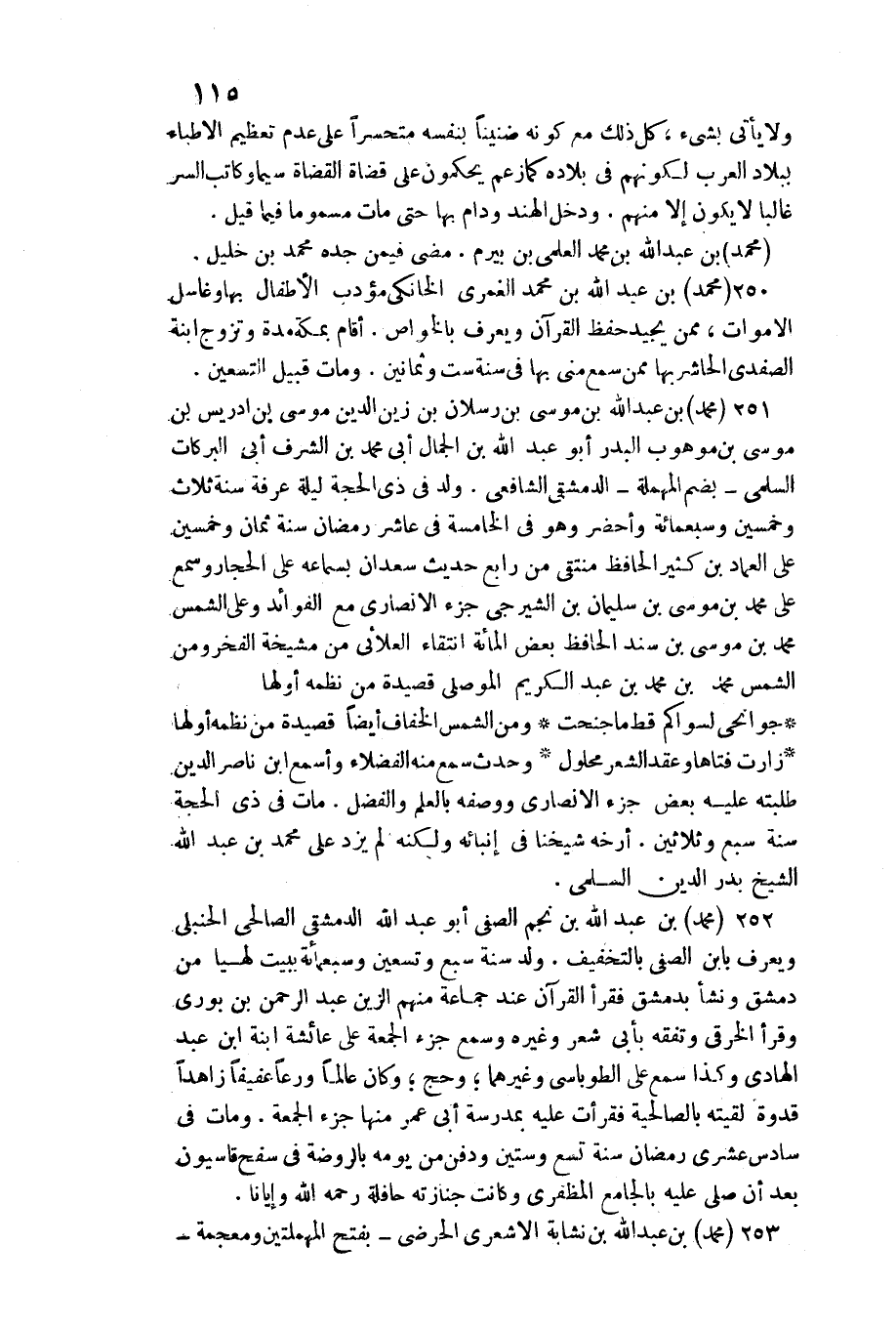مُحَمَّد بن عبد الله بن مُحَمَّد العلمي بن بيرم. مضى فِيمَن جده مُحَمَّد بن خَلِيل. مُحَمَّد بن عبد الله بن مُحَمَّد الغمري الخانكي مؤدب الْأَطْفَال بهَا وغاسل الْأَمْوَات، مِمَّن يجيد حفظ الْقُرْآن وَيعرف بالخواص. أَقَامَ بِمَكَّة مُدَّة وَتزَوج ابْنة الصَّفَدِي الحاشر بهَا مِمَّن سمع مني بهَا فِي سنة سِتّ وَثَمَانِينَ. وَمَات قبيل التسعين. مُحَمَّد بن عبد الله بن مُوسَى بن رسْلَان بن زين الدّين مُوسَى بن إِدْرِيس بن مُوسَى بن موهوب الْبَدْر أَبُو عبد الله بن الْجمال أبي مُحَمَّد بن الشّرف أبي البركات السّلمِيّ بِضَم الْمُهْملَة الدِّمَشْقِي الشَّافِعِي. ولد فِي ذِي الْحجَّة لَيْلَة عَرَفَة سنة ثَلَاث وَخمسين وَسَبْعمائة وأحضر وَهُوَ فِي الْخَامِسَة فِي عَاشر رَمَضَان سنة ثَمَان وَخمسين على الْعِمَاد بن كثير الْحَافِظ منتقى من رَابِع حَدِيث سَعْدَان بِسَمَاعِهِ على الحجار وَسمع على مُحَمَّد بن مُوسَى بن سُلَيْمَان الشيرجي جُزْء الْأنْصَارِيّ مَعَ الْفَوَائِد وعَلى الشَّمْس مُحَمَّد بن مُوسَى بن سَنَد الْحَافِظ بعض الْمِائَة انتقاء العلائي من مشيخة الْفَخر وَمن الشَّمْس مُحَمَّد بن مُحَمَّد بن عبد الْكَرِيم الْموصِلِي قصيدة من نظمه أَولهَا: جواني لسواكم قطّ مَا جنحت وَمن الشَّمْس الْخفاف أَيْضا قصيدة من نظمه أَولهَا: زارت فتاها وَعقد الشّعْر محلول وَحدث سمع مِنْهُ الْفُضَلَاء وأسمع ابْن نَاصِر الدّين طلبته عَلَيْهِ بعض جُزْء الْأنْصَارِيّ وَوَصفه بِالْعلمِ وَالْفضل. مَاتَ فِي ذِي الْحجَّة سنة سبع وَثَلَاثِينَ. أرخه شَيخنَا فِي إنبائه وَلكنه لم يزدْ على مُحَمَّد بن عبد الله الشَّيْخ بدر الدّين السّلمِيّ. مُحَمَّد بن عبد الله بن نجم الصفي أَبُو عبد الله الدِّمَشْقِي الصَّالِحِي الْحَنْبَلِيّ وَيعرف بِابْن الصفي بِالتَّخْفِيفِ. ولد سنة سبع وَتِسْعين وَسَبْعمائة بِبَيْت لهيا من دمشق وَنَشَأ بِدِمَشْق فَقَرَأَ القرآ عِنْد جمَاعَة مِنْهُم الزين عبد الرَّحْمَن بن بوري وَقَرَأَ الْخرقِيّ وتفقه بِأبي شعر وَغَيره وَسمع جُزْء الْجُمُعَة على عَائِشَة ابْنة ابْن عبد الْهَادِي وَكَذَا سمع على الطوباسي وَغَيرهمَا وَحج وَكَانَ عَالما ورعا عفيفا زاهدا قدوة لَقيته بالصالحية فَقَرَأت عَلَيْهِ بمدرسة أبي عمر مِنْهَا جُزْء الْجُمُعَة. وَمَات فِي سادس عشري رَمَضَان سنة تسع وَسِتِّينَ وَدفن من يَوْمه)