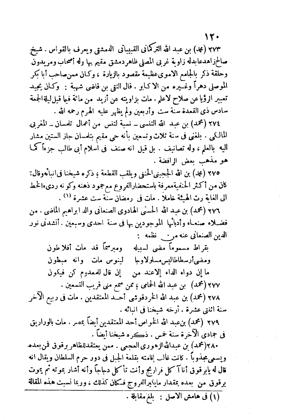 أرخه شَيخنَا فِي إنبائه. مُحَمَّد بن عبد الله الْخَواص أحد المعتقدين أَيْضا بِمصْر. مَاتَ بالوراريق فِي جُمَادَى الْآخِرَة سنة خمس. ذكره شَيخنَا أَيْضا. مُحَمَّد بن عبد الله الزهوري العجمي. مِمَّن يعْتَقد للظَّاهِر برقوق فَمن بعده وَيُسمى مجذوبا. كَانَت غَالب إِقَامَته بقلعة الْجَبَل فِي دور حرم السُّلْطَان وَيُقَال إِنَّه قَالَ لَهُ يَا برقوق أَنا آكل فراريج وَأَنت تَأْكُل دجاجا وَأَنه أَشَارَ بِمَوْتِهِ ثمَّ يَمُوت برقوق من بعده بِمِقْدَار مَا يكبر الْفروج فَكَانَ كَذَلِك، وَرُبمَا نسبت هَذِه الْمقَالة