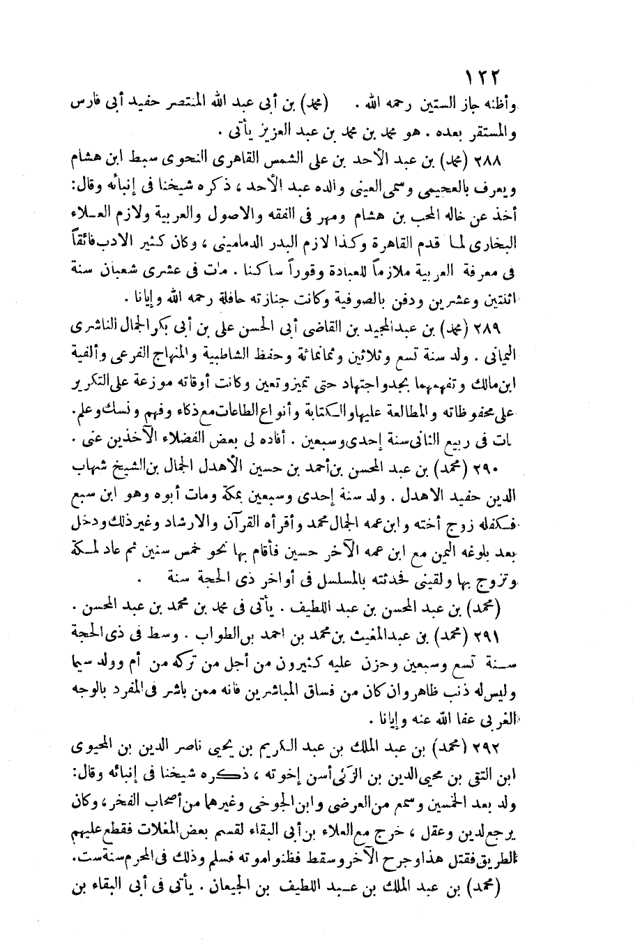 الْيَمَانِيّ. ولد سنة تسع وَثَلَاثِينَ وَثَمَانمِائَة وَحفظ الشاطبية والمنهاج الفرعي وألفية ابْن مَالك وتفهمهما بجد واجتهاد حَتَّى تميز وَتعين وَكَانَت أوقاته موزعة على التركير على محفوظاته والمطالعة عَلَيْهَا وَالْكِتَابَة وأنواع الطَّاعَات مَعَ ذكاء وَفهم ونسك وَعلم. مَاتَ فِي ربيع الثَّانِي سنة إِحْدَى وَسبعين. أَفَادَهُ لي بعض الْفُضَلَاء الآخذين عني. مُحَمَّد بن عبد المحسن بن أَحْمد بن حُسَيْن الأهدل الْجمال بن الشَّيْخ شهَاب الدّين حفيد الأهدل. ولد سنة إِحْدَى وَسبعين بِمَكَّة وَمَات أَبوهُ وَهُوَ ابْن سبع فَكَفَلَهُ زوج أُخْته وَابْن عَمه الْجمال مُحَمَّد وأقرأه الْقُرْآن والإرشاد وَغير ذَلِك وَدخل بعد بُلُوغه الْيمن مَعَ ابْن عَمه الآخر حُسَيْن فَأَقَامَ بهَا نَحْو خمس سِنِين ثمَّ عَاد لمَكَّة وَتزَوج بهَا ولقيني فَحَدَّثته بالمسلسل فِي أَوَاخِر ذِي الْحجَّة سنة.