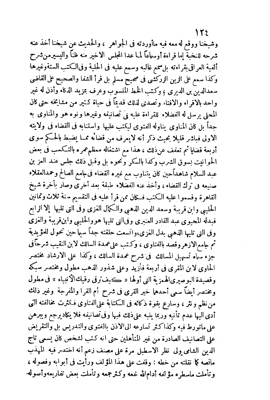 مُسلم بل قَرَأَ الشفا وَالصَّحِيح على القَاضِي سعد الدّين بن الديري وَكتب الْخط الْمَنْسُوب وَعرف بمزيد الذكاء وَأذن لَهُ غير وَاحِد بالإقراء والإفتاء وتصدى لذَلِك قَدِيما فِي حَيَاة كثير من مشايخه حَتَّى كَانَ الْمحلى يُرْسل لَهُ الْفُضَلَاء للْقِرَاءَة عَلَيْهِ فِي تصانيفه وَغَيرهَا ونوه هُوَ والمناوي بِهِ جدا بل كَانَ الْمَنَاوِيّ يناوله الْفَتْوَى ليكتب عَلَيْهَا واستنابه فِي الْقَضَاء فِي ولَايَته الأولى فباشر قَلِيلا بِحَيْثُ ذكر أَنه لَا يعرف من قَضَائِهِ مِمَّا يضْبط بالحكم سوى أَرْبَعَة قضايا ثمَّ تعفف عَن ذَلِك، هَذَا مَعَ اشْتِغَاله مُعظم عمره بالتكسب فِي بعض الحوانيت بسوق الشّرْب وَكَذَا بالسكر وَنَحْوه بل وَقبل ذَلِك جلس عِنْد الْعِزّ بن عبد السَّلَام شَاهدا حِين كَانَ يتناوب مَعَ غَيره الْقَضَاء فِي جَامع الصَّالح وَحمد الْعُقَلَاء صَنِيعه فِي ترك الْقَضَاء، وَأخذ عَنهُ الْفُضَلَاء طبقَة بعد أُخْرَى وَصَارَ بِأُخْرَى شيخ الْقَاهِرَة وقسموا عَلَيْهِ الْكتب فَكَانَ مِمَّن قَرَأَ عَلَيْهِ فِي التَّقْسِيم سنة ثَلَاث وَثَمَانِينَ الحليبي وَابْن قريبَة وَسعد الدّين الذَّهَبِيّ والكمال الْغَزِّي وَفِي الَّتِي تَلِيهَا إِلَّا الرَّابِع فبدله المحيوي عبد الْقَادِر الْعَنْبَري وَفِي الَّتِي تَلِيهَا هُوَ والحليبي وَابْن قريبَة والغزي وَفِي الَّتِي تَلِيهَا الذَّهَبِيّ بلد الْغَزِّي، واتسعت حلقته جدا سِيمَا حِين تهحول للمؤيدية ثمَّ جَامع الْأَزْهَر وَقصد بالفتاوى، وَكتب عل عمد السالك لِابْنِ النَّقِيب شرحا فِي جُزْء سَمَّاهُ تسهيل المسالك فِي شرح عُمْدَة السالك، وَكَذَا على الْإِرْشَاد مُخْتَصر الْحَاوِي لِابْنِ الْمقري فِي أَرْبَعَة فأزيد وعَلى شذور الذَّهَب مطول ومختصر سبكه وقصيدة البوصيري الهمزية الَّتِي أَولهَا كَيفَ ترقى رقيك الْأَنْبِيَاء فِي مطول ومختصر أَيْضا سمى أَحدهمَا خير الْقرى فِي شرح أم القرا والمفرجة وَغير ذَلِك من نظم ونثر، وسارع بِقُوَّة ذكائه فِي الْكِتَابَة على الْفَتَاوَى فكثرت مُخَالفَته الَّتِي أدّى إِلَيْهَا عدم تأنيه وَرُبمَا يُنَبه على ذَلِك فِيهَا وَفِي تصانيفه فَلَا يكَاد يرجع ويبرهن على مَا تورط فِيهِ وَكَذَا كثر تسارعه إِلَى الْأذن بالفتوى والتدريس بل والتقريض على التصانيف الصادرة من غير المتأهلين حَتَّى إِنَّه كتب لشخص كَانَ يُسمى تَاج الدّين الشَّامي ولي نظر الإسطبل مرّة على مُصَنف زعم أَنه اختصر فِيهِ الْمُهَذّب مَا نَصه كَمَا نقلته من خطه: وقفت على هَذَا الْمُؤلف وَرَأَيْت فِي أبوابه وفصوله، وتأملت مَا سطره مُؤَلفه أدام الله نَفعه وَكثر جمعه وتأملت بعض تفاريعه وأصوله