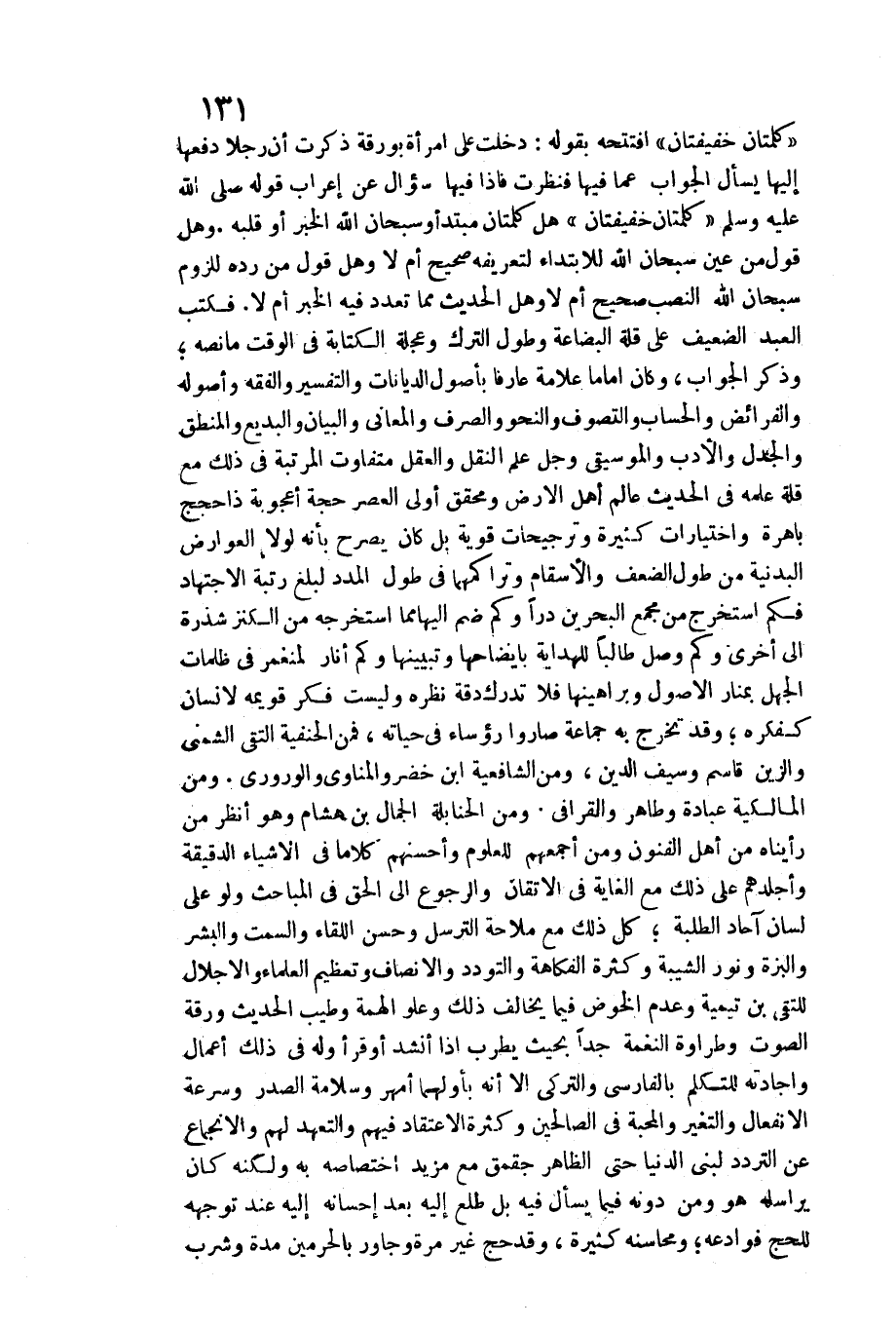 كلمتان خفيفتان افتتحه بقوله: دخلت على ارمأة بِوَرَقَة ذكرت أَن رجلا دَفعهَا إِلَيْهَا يسْأَل الْجَواب عَمَّا فِيهَا فَنَظَرت فَإِذا فِيهَا سُؤال عَن إِعْرَاب قَوْله صلى الله عَلَيْهِ وَسلم كلمتان خفيفتان هَل كلمتان مُبْتَدأ وَسُبْحَان الله الْخَبَر أَو قلبه. وَهل قَول من عين سُبْحَانَ الله للابتداء لتعريفه صَحِيح أم لَا وَهل قَول من رده للُزُوم سُبْحَانَ الله النصب صَحِيح أم لَا وَهل الحَدِيث مِمَّا تعدد فِيهِ الْخَبَر أم لَا. فَكتب العَبْد الضَّعِيف على قلَّة البضاعة وَطول التّرْك وعجلة الْكِتَابَة فِي الْوَقْت مَا نَصه وَذكر الْجَواب، وَكَانَ إِمَامًا عَلامَة عَارِفًا بأصول الديانَات وَالتَّفْسِير وَالْفِقْه وأصوله والفرائض والحساب والتصوف والنحو وَالصرْف والمعاني وَالْبَيَان والبديع والمنطق والجدل وَالْأَدب والموسيقى وَجل علم النَّقْل وَالْعقل متفاوت الْمرتبَة فِي ذَلِك مَعَ قلَّة علمه فِي الحَدِيث عَالم أهل الأَرْض ومحقق أولى الْعَصْر حجَّة أعجوبة ذَا حجج باهرة واختيارات كَثِيرَة وترجيحات قَوِيَّة بل كَانَ يُصَرح بِأَنَّهُ لَوْلَا الْعَوَارِض الْبَدَنِيَّة من طول الضعْف والأسقام وتراكمهما فِي طول المدد لبلغ رُتْبَة الِاجْتِهَاد فكم استخرج من مجمع الْبَحْرين درا وَكم ضم إِلَيْهَا مِمَّا استخرجه من الْكَنْز شذرة إِلَى أُخْرَى وَكم وصل طَالبا للهداية بإيضاحها وتبيينها وَكم أنار لمنغمر فِي ظلمات الْجَهْل بمنار الْأُصُول وبراهينها فَلَا تدْرك دقة نظره وَلَيْسَت فكر قويمة لإِنْسَان كفكره وَقد تخرج بِهِ جمَاعَة صَارُوا رُؤَسَاء فِي حَيَاته، فَمن الْحَنَفِيَّة التقي الشَّمْس والزين قَاسم وَسيف الدّين، وَمن الشَّافِعِيَّة ابْن خضر والمناوي والوروري. وَمن الْمَالِكِيَّة عبَادَة وطاهر والقرافي. وَمن الْحَنَابِلَة الْجمال بن هِشَام وَهُوَ أنظر من رَأَيْنَاهُ من أهل الْفُنُون وَمن أجمعهم للعلوم وَأَحْسَنهمْ كلَاما فِي الْأَشْيَاء الدقيقة وأجلدهم على ذَلِك مَعَ الْغَايَة فِي الاتقان وَالرُّجُوع إِلَى الْحق فِي المباحث وَلَو على لِسَان آحَاد الطّلبَة كل ذَلِك مَعَ)
