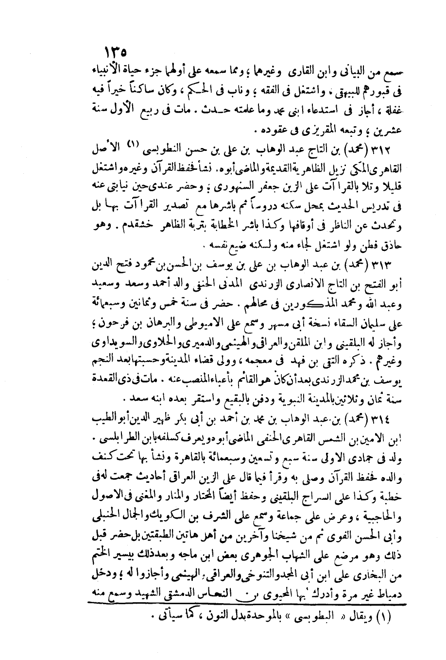 سمع من الْبَيَانِي وَابْن الْقَارِي وَغَيرهمَا وَمِمَّا سَمعه على أَولهمَا جُزْء حَيَاة الْأَنْبِيَاء فِي قُبُورهم للبيهقي، واشتغل فِي الْفِقْه وناب فِي الحكم، وَكَانَ سَاكِنا خيرا فِيهِ غَفلَة، أجَاز فِي استدعاء ابْني مُحَمَّد وَمَا عَلمته حدث. مَاتَ فِي ربيع الأول سنة عشْرين وَتَبعهُ المقريزي فِي عقوده. مُحَمَّد بن التَّاج عبد الْوَهَّاب بن عَليّ بن حسن النطوبسي الأَصْل القاهري الْمَكِّيّ نزيل الظَّاهِرِيَّة الْقَدِيمَة والماضي أَبوهُ. نَشأ فحفظ الْقُرْآن وَغَيره واشتغل قَلِيلا وتلا بالقراآت على الزين جَعْفَر السنهوري وَحضر عِنْدِي حِين نيابتي عَنهُ فِي تدريس الحَدِيث بِمحل سكنه دروسا ثمَّ بَاشَرَهَا مَعَ تصدير القراآت بهَا بل وتحدث عَن النَّاظر فِي أوقافها وَكَذَا بَاشر الخطابة بتربة الظَّاهِر خشقدم. وَهُوَ حاذق فطن وَلَو اشْتغل لجاء مِنْهُ وَلكنه ضيع نَفسه. مُحَمَّد بن عبد الْوَهَّاب بن عَليّ بن يُوسُف بن الْحسن بن مَحْمُود فتح الدّين أَبُو الْفَتْح بن التَّاج الْأنْصَارِيّ الزرندي الْمدنِي الْحَنَفِيّ وَالِد أَحْمد وَسعد وَسَعِيد وَعبد الله وَمُحَمّد الْمَذْكُورين فِي محالهم. حضر فِي سنة خمس وَثَمَانِينَ وَسَبْعمائة على سُلَيْمَان السقاء نُسْخَة أبي مسْهر وَسمع على الأميوطي والبرهان بن فَرِحُونَ وَأَجَازَ لَهُ البُلْقِينِيّ وَابْن الملقن والعراقي والهيثمي والدميري والحلاوي والسويداوي وَغَيرهم. ذكره التقي بن فَهد فِي مُعْجَمه، وَولي قَضَاء الْمَدِينَة وحسبتها بعد النَّجْم يُوسُف بن مُحَمَّد الزرندي بعد أَن كَانَ هُوَ الْقَائِم بأعباء المنصب عَنهُ. مَاتَ فِي ذِي الْقعدَة سنة ثَمَان وَثَلَاثِينَ بِالْمَدِينَةِ النَّبَوِيَّة وَدفن)