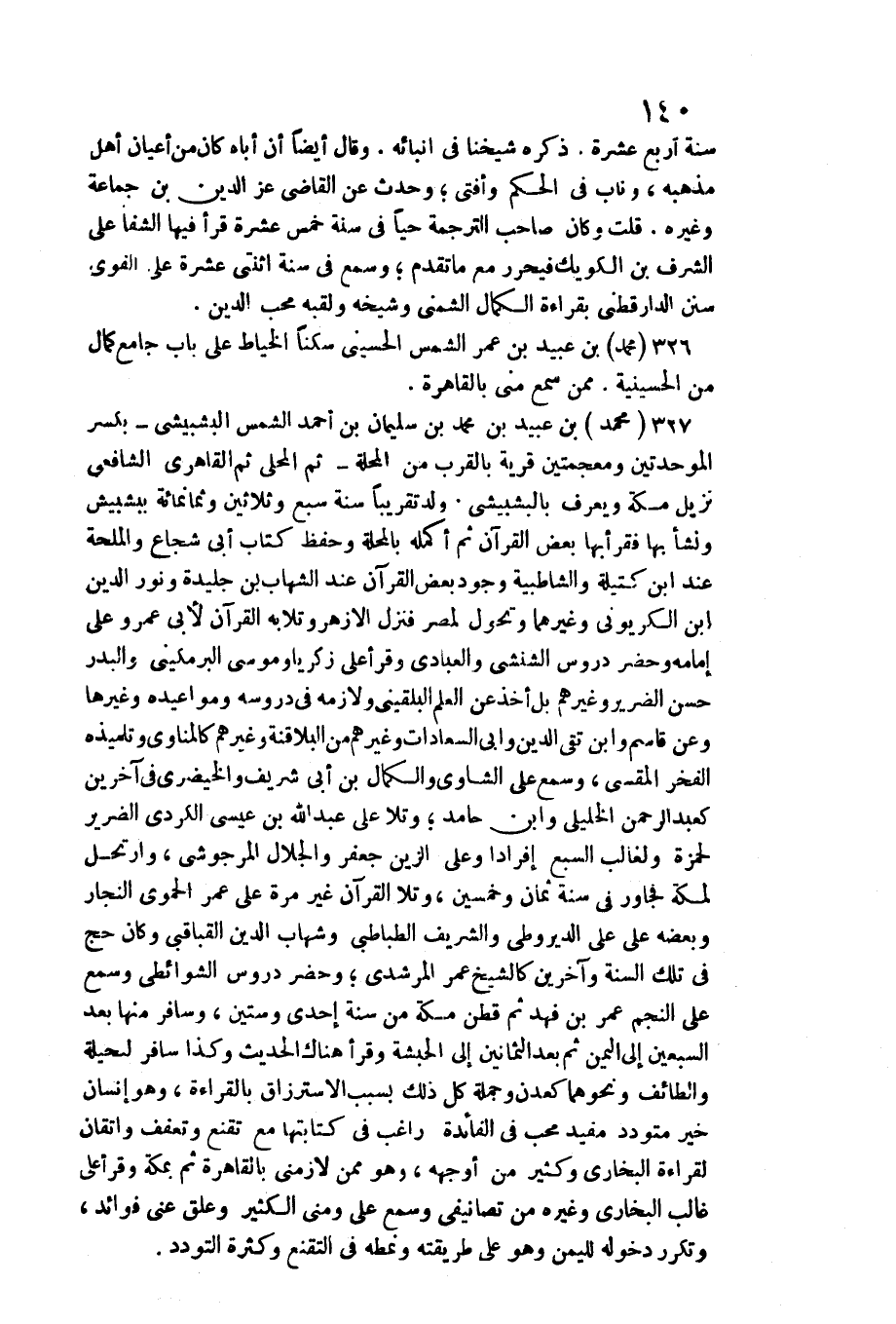 سنة أَربع عشرَة. ذكره شَيخنَا فِي إنبائه. وَقَالَ أَيْضا أَن أَبَاهُ كَانَ من أَعْيَان أهل مذْهبه، وناب فِي الحكم وَأفْتى وَحدث عَن القَاضِي عز الدّين بن جمَاعَة وَغَيره. قلت وَكَانَ صَاحب التَّرْجَمَة حَيا فِي سنة خمس عشرَة قَرَأَ فِيهَا الشفا على الشّرف بن الكويك فيحرر مَعَ مَا تقدم وَسمع فِي سنة اثْنَتَيْ عشرَة على الفوى سنَن الدَّارَقُطْنِيّ بِقِرَاءَة الْكَمَال الشمني وَشَيْخه ولقبه محب الدّين. مُحَمَّد بن عبيد بن عمر الشَّمْس الْحُسَيْنِي سكنا الْخياط على بَاب جَامع كَمَال من الحسينية. مِمَّن سمع مني بِالْقَاهِرَةِ.) ::: مُحَمَّد بن عبيد بن مُحَمَّد بن سُلَيْمَان بن أَحْمد الشَّمْس البشبيشي بِكَسْر الموحدتين ومعجمتين قَرْيَة بِالْقربِ من الْمحلة ثمَّ الْمحلي ثمَّ القاهري الشَّافِعِي نزيل مَكَّة وَيعرف بالبشبيشي. ولد تَقْرِيبًا سنة سبع وَثَلَاثِينَ وَثَمَانمِائَة ببشبيش وَنَشَأ بهَا فَقَرَأَ بهَا بعض الْقُرْآن ثمَّ أكمله بالمحلة وَحفظ كتاب أبي شُجَاع والملحة عِنْد ابْن كتيلة والشاطبية وجود بعض الْقُرْآن عِنْد الشهَاب بن جليدة وَنور الدّين ابْن الكريوني وَغَيرهمَا وتحول لمصر فَنزل الْأَزْهَر وتلا بِهِ الْقُرْآن لأبي عَمْرو على إِمَامه وَحضر دروس الشنشي والعبادي وَقَرَأَ على زَكَرِيَّا ومُوسَى البرمكيني والبدر حسن الضَّرِير وَغَيرهم بل أَخذ عَن الْعلم البُلْقِينِيّ ولازمه فِي دروسه ومواعيده وَغَيرهَا وَعَن قَاسم وَابْن تَقِيّ الدّين وَأبي السعادات وَغَيرهم من البلاقنة وَغَيرهم كالمناوي وتلميذه الْفَخر المقسي، وَسمع على الشاوي والكمال بن أبي شرِيف والخيضري فِي آخَرين كَعبد الرَّحْمَن الخليلي وَابْن حَامِد وتلا على عبد الله بن عِيسَى الْكرْدِي الضَّرِير لِحَمْزَة ولغالب السَّبع إفرادا وعَلى الزين جَعْفَر والجلال المرجوشي، وارتحل لمَكَّة فجاور فِي سنة ثَمَان وَخمسين، وتلا الْقُرْآن غير مرّة على عمر الْحَمَوِيّ النجار وَبَعضه على عَليّ الديروطي والشريف الطباطبي وشهاب الدّين القباقبي وَكَانَ حج فِي تِلْكَ السّنة وَآخَرين كالشيخ عمر المرشدي وَحضر دروس الشوائطي وَسمع على النَّجْم عمر بن فَهد ثمَّ قطن مَكَّة من سنة إِحْدَى وَسِتِّينَ، وسافر مِنْهَا بعد السّبْعين إِلَى الْيمن ثمَّ بعد الثَّمَانِينَ إِلَى الْحَبَشَة وَقَرَأَ هُنَاكَ الحَدِيث وَكَذَا سَافر للحيلة والطائف وَنَحْوهمَا كعدن وَجُمْلَة كل ذَلِك بِسَبَب الاسترزاق بِالْقِرَاءَةِ، وَهُوَ إِنْسَان خير متودد مُفِيد محب فِي الْفَائِدَة رَاغِب فِي كتَابَتهَا مَعَ تقنع وتعفف واتقان لقِرَاءَة البُخَارِيّ وَكثير من أوجهه، وَهُوَ مِمَّن لازمني بِالْقَاهِرَةِ ثمَّ بِمَكَّة وَقَرَأَ على غَالب البُخَارِيّ وَغَيره من تصانيفي وَسمع عَليّ ومني الْكثير وعلق عني فَوَائِد، وتكرر دُخُوله لليمن وَهُوَ على طَرِيقَته ونمطه فِي التقنع وَكَثْرَة التودد.
