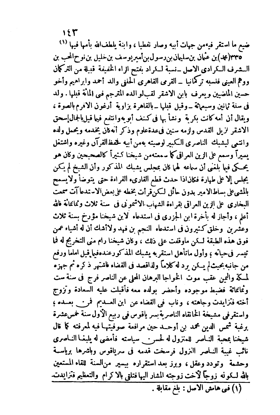 الشّرف الكرادي الأَصْل نِسْبَة لكراد بِفَتْح الرَّاء الْخَفِيفَة قَبيلَة من التركمان وَوهم الْعَيْنِيّ فنسبه تركمانيا القرمي القاهري الْحَنَفِيّ وَالِد أَحْمد وَإِبْرَاهِيم وأخو حُسَيْن الماضيين وَيعرف بِابْن الْأَشْقَر لقب لوالده المترجم فِي الْمِائَة قبلهَا. ولد فِي سنة ثَمَانِينَ وَسَبْعمائة وَقيل قبلهَا بِالْقَاهِرَةِ بزاوية أرغون الأقرم بالصوة، وَيُقَال أَن أمه كَانَت بكرية وَنَشَأ بهَا فِي كنف أَبَوَيْهِ وانتفع فِيمَا قيل بالجمال إِسْحَاق الْأَشْقَر نزيل الْقُدس وَلَزِمَه سِنِين فِي عدَّة عُلُوم وَذكر أَنه كَانَ يَخْدمه وَيحمل وَلَده وانتمى ليشبك الناصري الْكَبِير لوصيته بِهِ من أَبِيه فحفظ الْقُرْآن وَغَيره واشتغل يَسِيرا وَسمع على الزين الْعِرَاقِيّ كَمَا سمعته من شَيخنَا كثيرا كالصحيحين وَكَانَ هُوَ يحْكى فِيمَا بَلغنِي أَن سَمَاعه لَهما كَانَ بِمَجْلِس يشبك الْمَذْكُور وَأَن الشَّيْخ لم يكن يجلس إِلَّا على طَهَارَة فَكَانَ إِذا حدث قطع الْقَارئ الْقِرَاءَة حَتَّى يتَوَضَّأ وَلَا يسمح بِالْمَشْيِ على بِسَاط الْأَمِير بِدُونِ حَائِل لَكِن قَرَأت بِخَطِّهِ على بعض الاستدعاآت سَمِعت البُخَارِيّ على الزين الْعِرَاقِيّ بِقِرَاءَة الشهَاب الأشموني فِي سنة ثَلَاث وَثَمَانمِائَة فَالله أعلم، وَأَجَازَ لَهُ بِأخرَة ابْن الْجَزرِي فِي استدعاء النَّجْم بن فَهد وَلَا أَشك أَن لَهُ أَشْيَاء عَمَّن فَوق هَذِه الطَّبَقَة لَكِن مَا وقفت على ذَلِك، وَكَانَ شَيخنَا رام مني التَّخْرِيج لَهُ فَمَا تيَسّر فِي حَيَاته وَأول مَا تأهل اسْتَقر بِهِ يشبك الْمَذْكُور عِنْده فِيمَا قيل إِمَامًا وَرفع من جَانِبه بِحَيْثُ لم يكن يرد لَهُ كلَاما وَلذَا قصد فِي الْقَضَاء فاشتهر ذكره ثمَّ جهزه لمَكَّة واليمن عقب موت الخواجا الْبُرْهَان الْمحلي عَن النَّاصِر فرج فِي سنة سِتّ وَثَمَانمِائَة فضبط موجوده وأحر بولده مَعَه فَأَقْبَلت عَلَيْهِ السَّعَادَة وَتزَوج أُخْته فتزايدت وجاهته، وناب فِي الْقَضَاء عَن ابْن العديم فَمن بعده وَاسْتقر فِي مشيخة الخانقاه الناصرية بسرياقوس فِي ربيع الأول سنة خمس عشرَة برغبة شمس الدّين مُحَمَّد بن أوحد حِين مرافعة صوفيتها فِيهِ لمعرفته كَمَا قَالَ شَيخنَا بمحبة النَّاصِر للمنزول لَهُ لحسن سياسته فَأمْضى لَهُ يلبغا الناصري نَائِب غيبَة النَّاصِر النُّزُول فرسخت قدمه فِي سرياقوس وباشرها برياسة وحشمة وتودد وعقل، وبرز بعد استقراره بِيَسِير من السّنة للقاء المستعين بِاللَّه لكَونه زوجا لأخت زَوجته الْمشَار إِلَيْهَا فتلقي بالإكرام والتعظيم فتزايدت